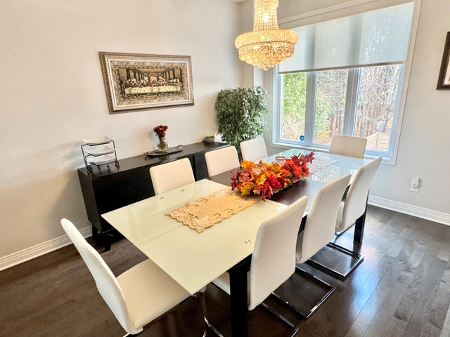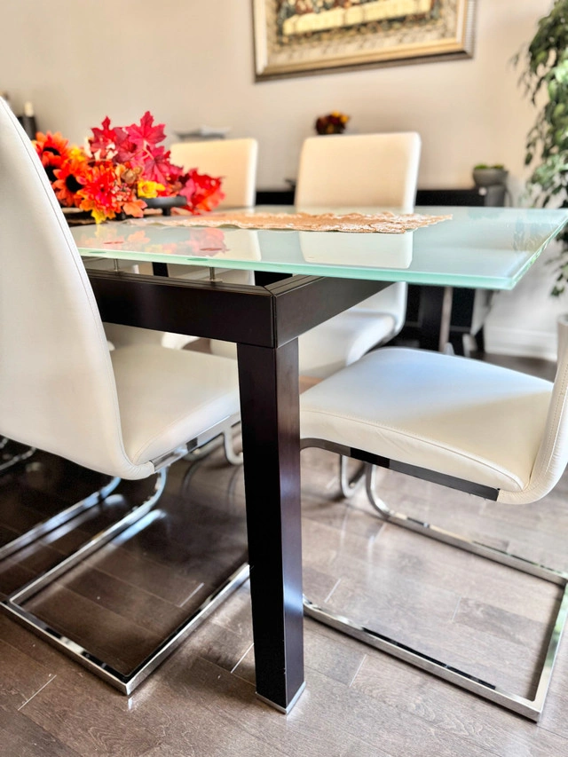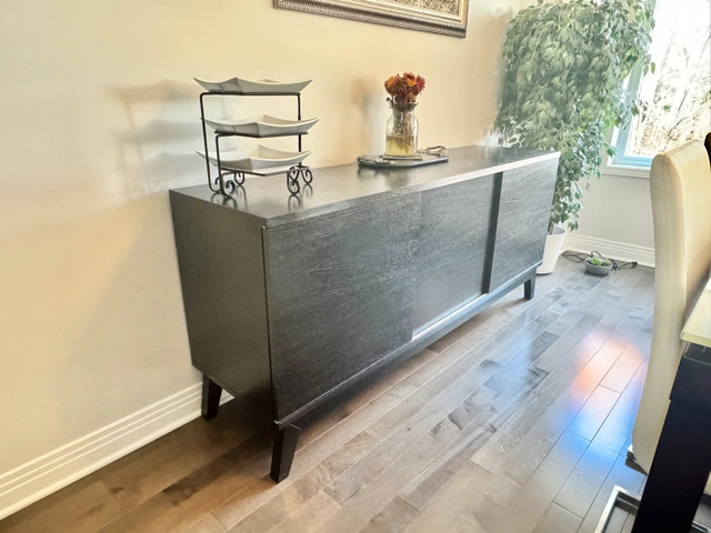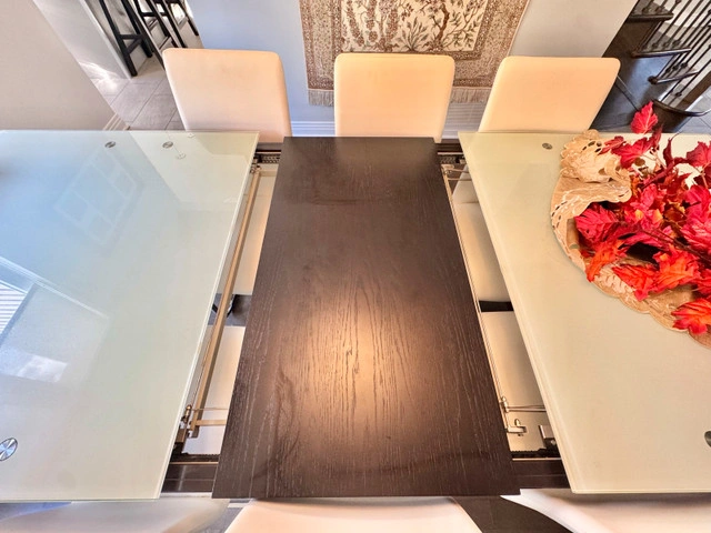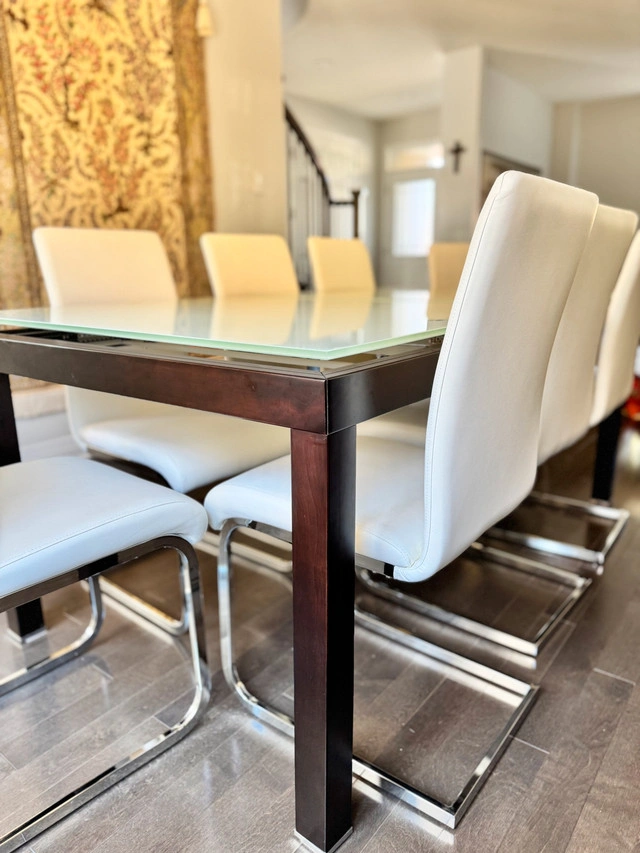 Near pristine frosted glass table with 8 leatherette chairs. There are very minor scratches on the glass but impossible to capture with camera. The chairs are under 1.5 years old in brand new perfect condition (receipt available). The table is very heavy with square metal legs and a high quality smooth extension mechanism sliding to expose a wood extension. The table width is 39 inches. Fully extended the table is 71 inches and without the extension the table is 51 inches (extension is 20 inches). Purchased in 2013 for more that $7000. Also selling a complementary hutch made my Skovby in near pristine condition. 71 inches in width, 18 inches in depth and 31.5 inches in height. The hutch is divided in two main sections. One section comprised of 3 shallow drawers for silvers storage and open storage underneath. The other section is divided by one shelf for the remaining length of the hutch accessible from two sliding doors. The hutch includes a hidden tray and a compartment for trays or placemats. Asking $300 for the hutch.