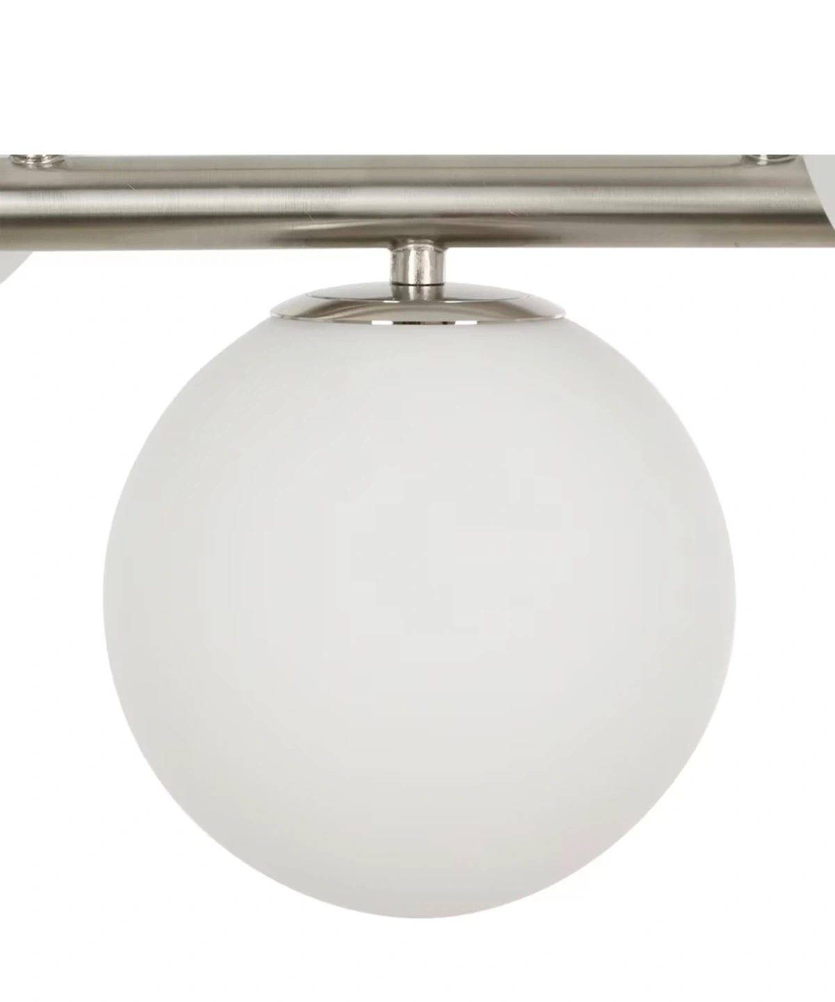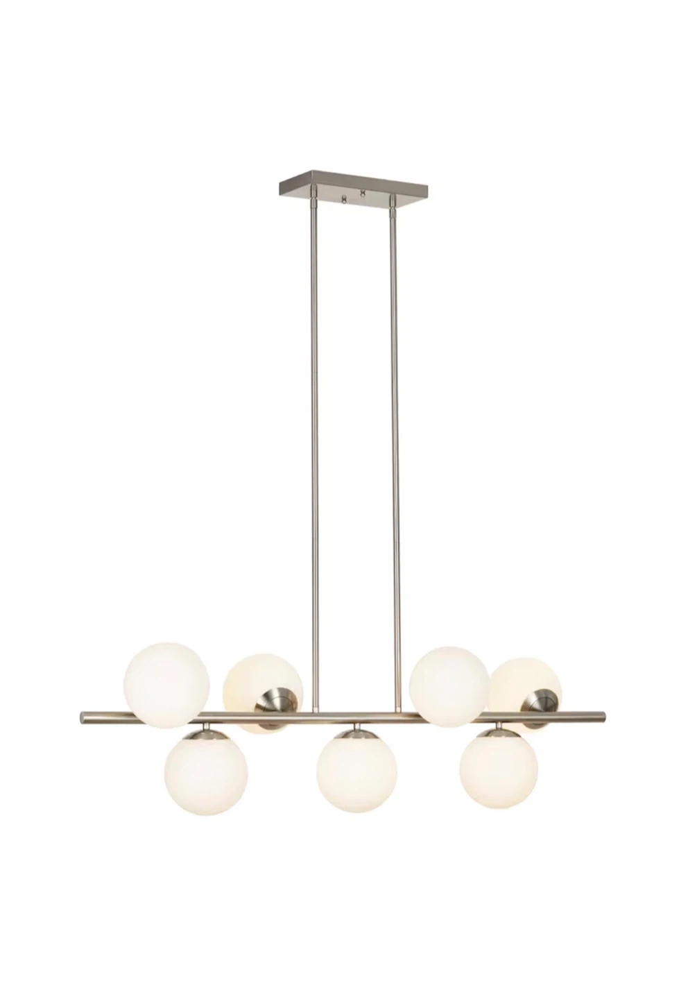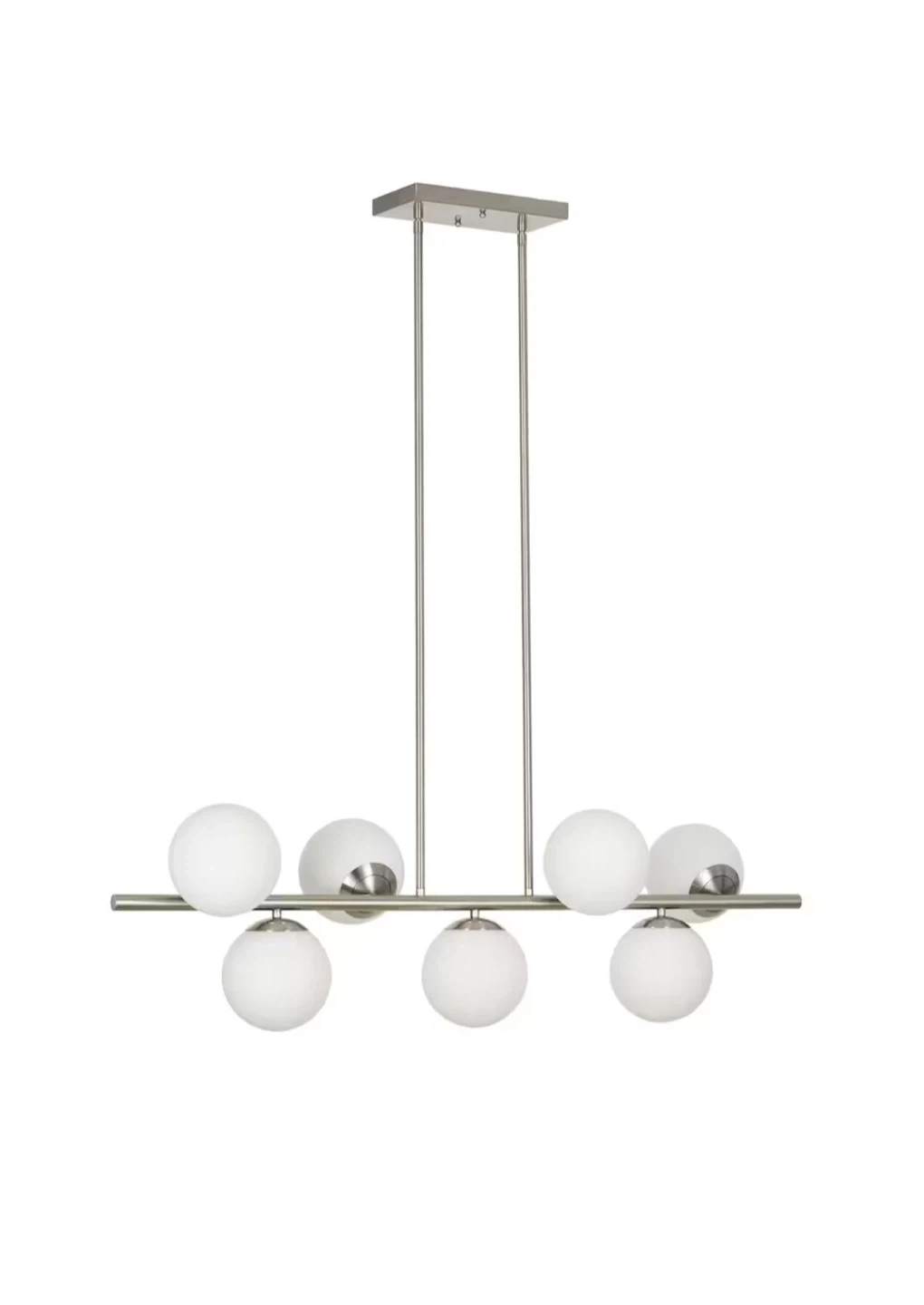 63Add a touch of modern elegance to your home with this stylish globe pendant light fixture! It features a sleek design with multiple white glass globes suspended from a brushed nickel frame. Perfect for dining rooms, living rooms, or entryways. The dimensions are approximately 51" in height, 42" in width, and each globe is about 5.9" in diameter