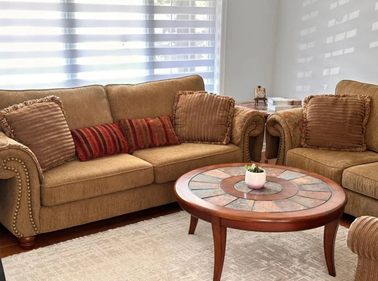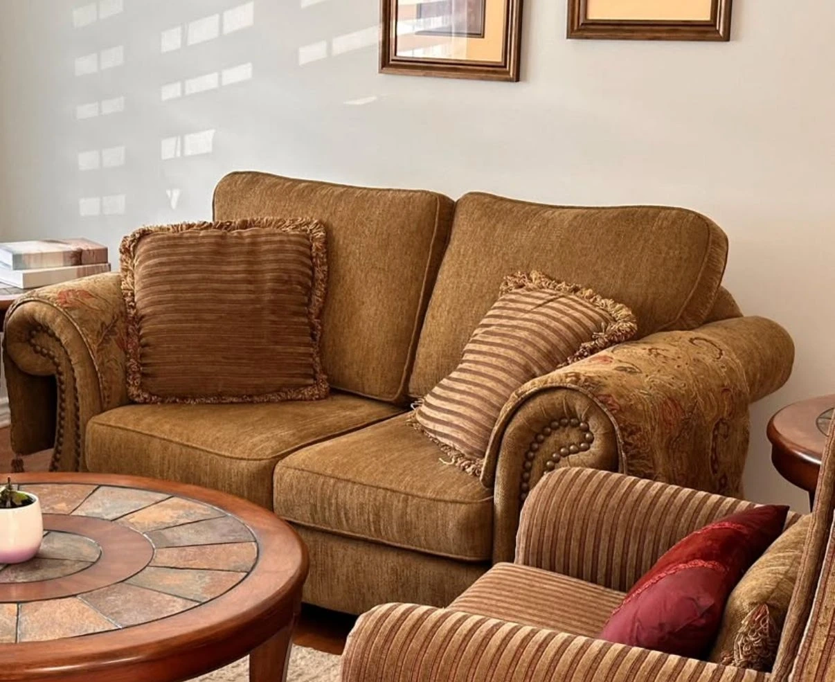 Selling a comfy brown sofa set that includes a sofa, loveseat, and armchair. It comes with decorative pillows to match. The set is in good condition and would be perfect for a living room or family room