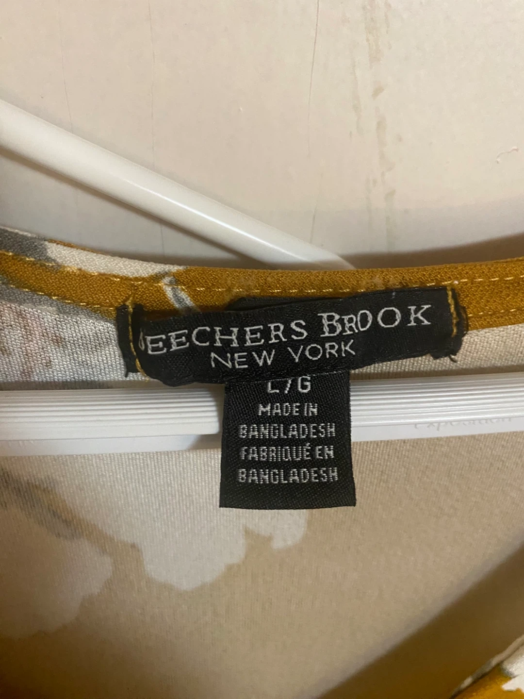 This is a Beechers Brook dress in a beautiful mustard colour with a floral pattern. It's a size L and made in Bangladesh. Perfect for a sunny day!