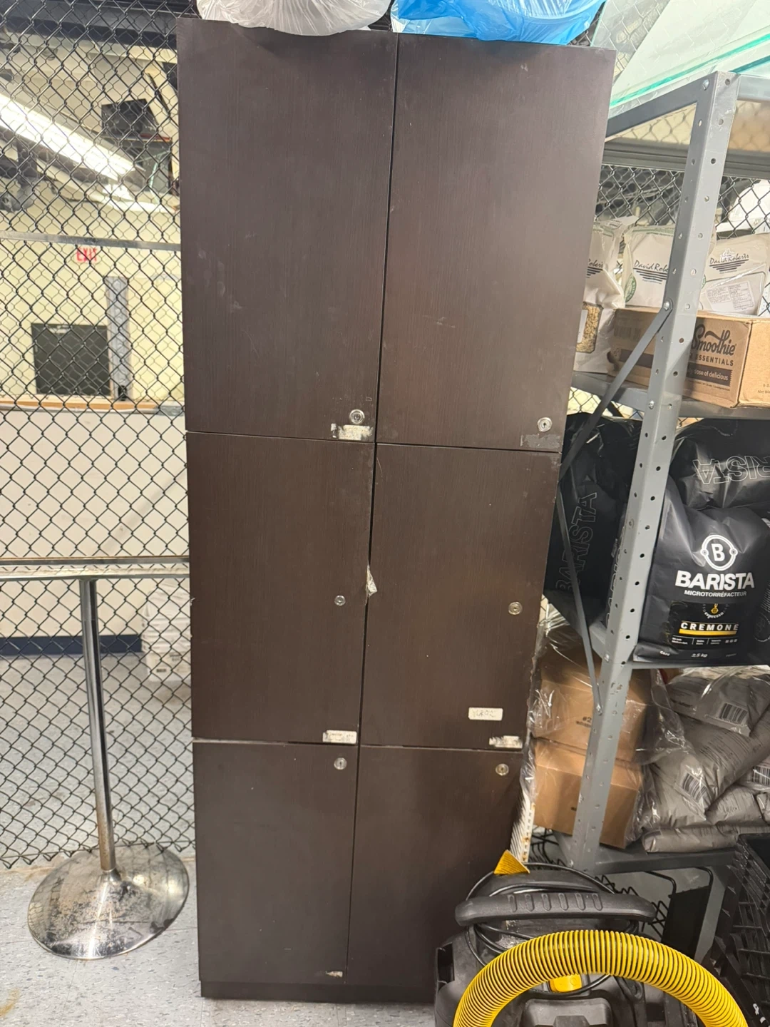 Selling a brown wooden locker cabinet. It has six compartments with individual doors and locks. It shows some signs of wear and tear, but is still functional.