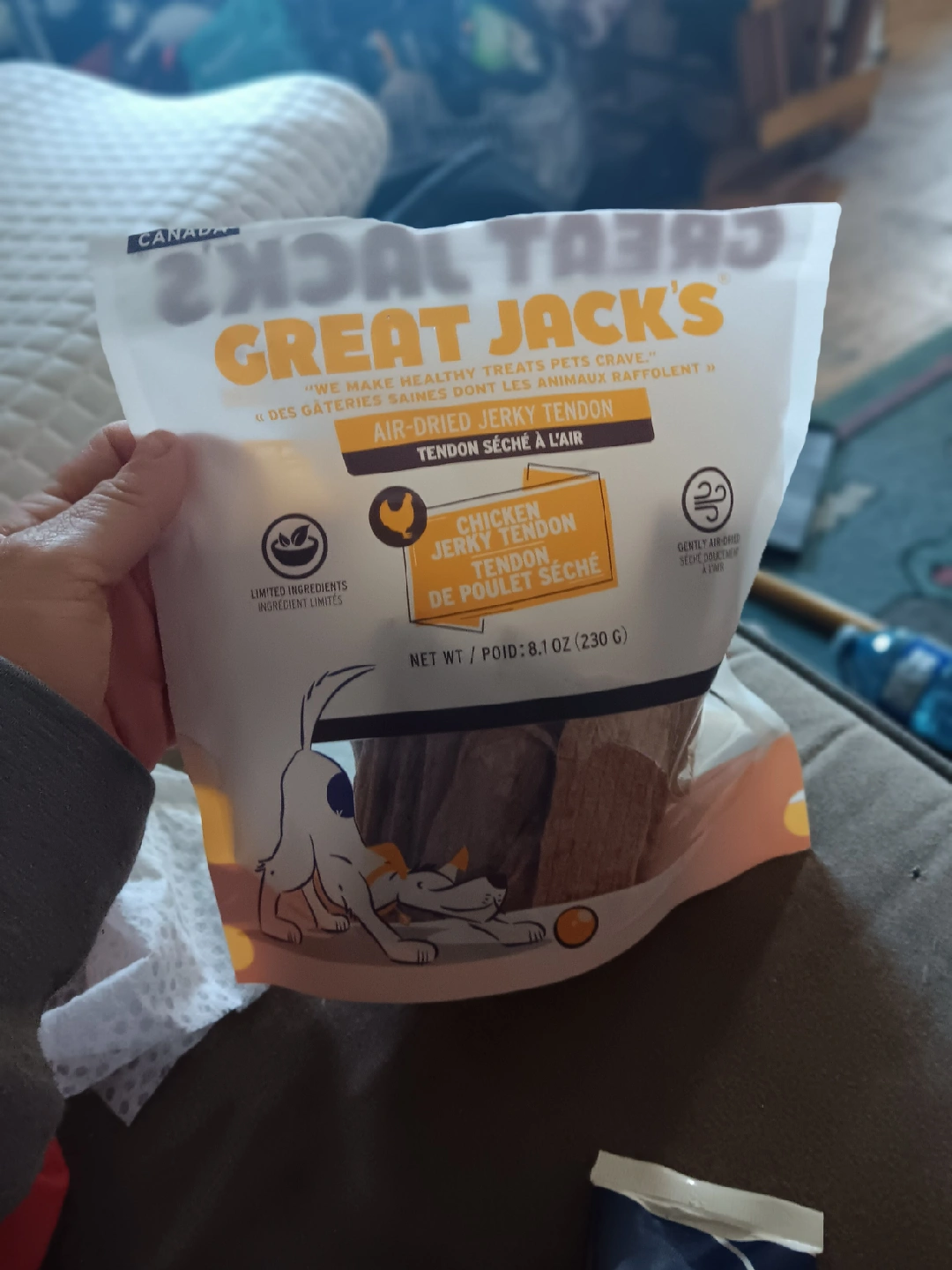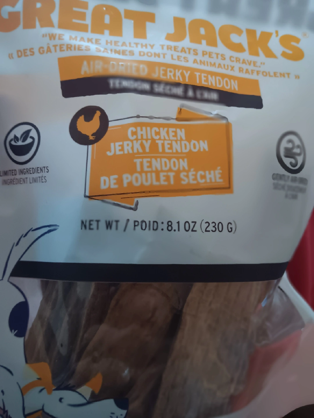 1000+Selling a open bag of Great Jack's Chicken Jerky Tendon dog treats! These are air-dried and made with limited ingredients. Net weight is 8.1 oz (230 g). Expiry date is 2027 March 10