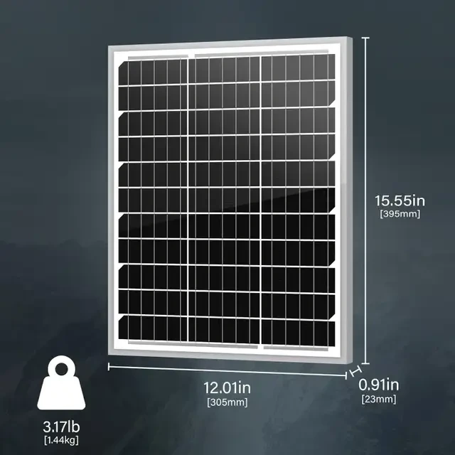 Compact and portable solar panel measuring 39.5 x 30.5 x 2.3 cm, delivering 20W output (19.08V, 1.05A). Made from high-efficiency monocrystalline silicon with pre-drilled mounting holes and 3 ft bare-end wire for easy setup—ideal for small off-grid power needs, RVs, boats, or battery maintenance. Weighs just 1.54 kg.