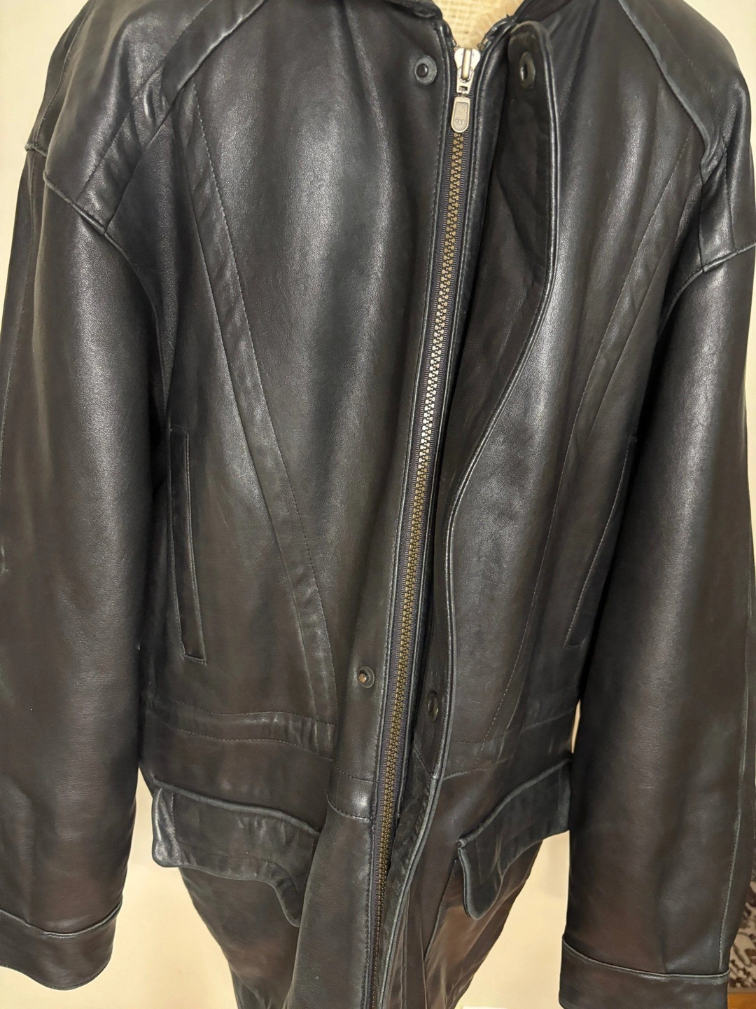 23Bring a classic leather coat into your your wardrobe with the Guy Laroche Men's Black Leather Coat. Crafted from premium leather, this timeless piece showcases sophistication, class and durability. A stylish leather coat for the man that expects quality. With a simple yet classic sleek design, a tailored 3/4 length fit and versatile style it is perfect for both casual outings and formal occasions. Pair it with jeans, dress pants or khakis for versatile style options. Features include a comfortable nylon inner lining, multiple pockets for practicality, and a premium finish for lasting appeal. Whether you're dressing up for a more formal event or dressing down for a stroll or a casual social gathering, this coat is the ultimate blend of luxury and function. Make a bold style statement with this Guy Laroche leather coat today. This is a size 44 men's leather coat. For measurements, please see the attached picture included with this listing. Although pre-owned, this is in great condition with no rips, tears or cuts. Local pickup is in Etobicoke near Islington and The Westway. We offer shipping and local delivery for this item. Please send a message about availability and cost associated with these respective services.