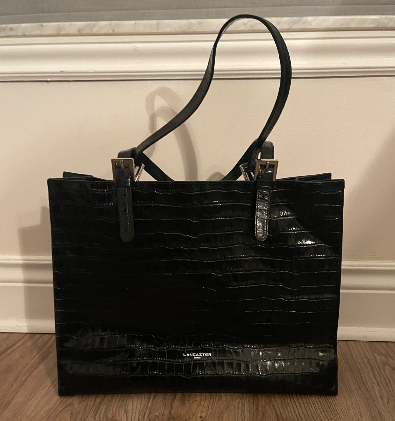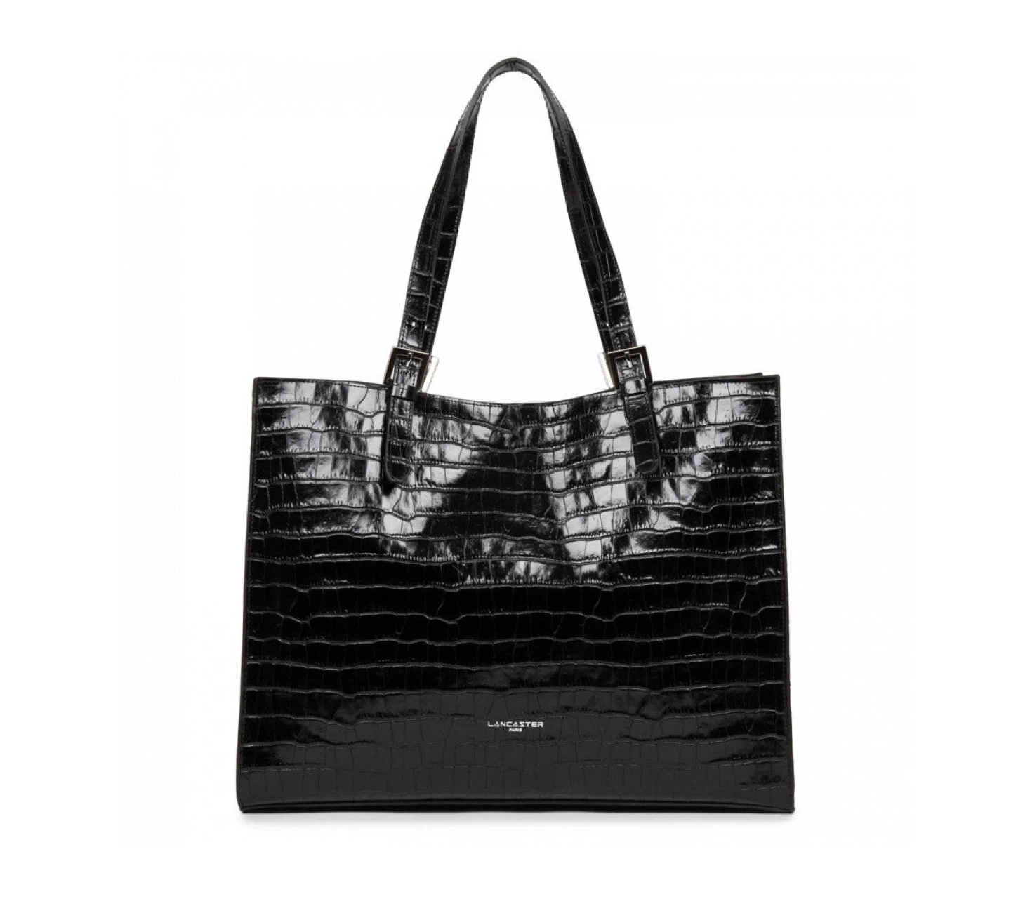 Lancaster Paris Black Leather Croc-Embossed Large Tote Bag