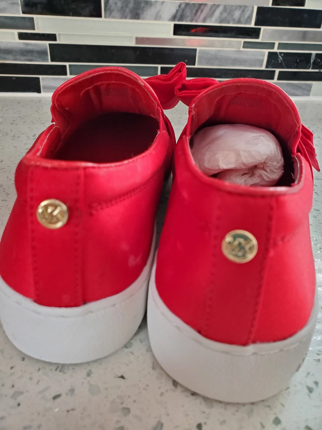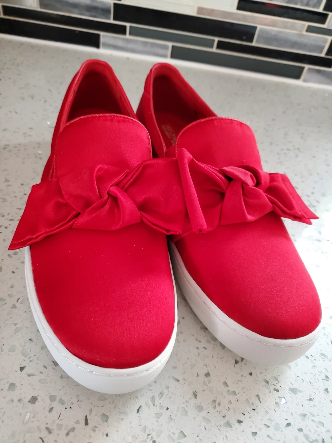 Cute red slip on shoes from Michael Kors! These are a fun pop of colour for any outfit. They are in Brand new and ready for a new home