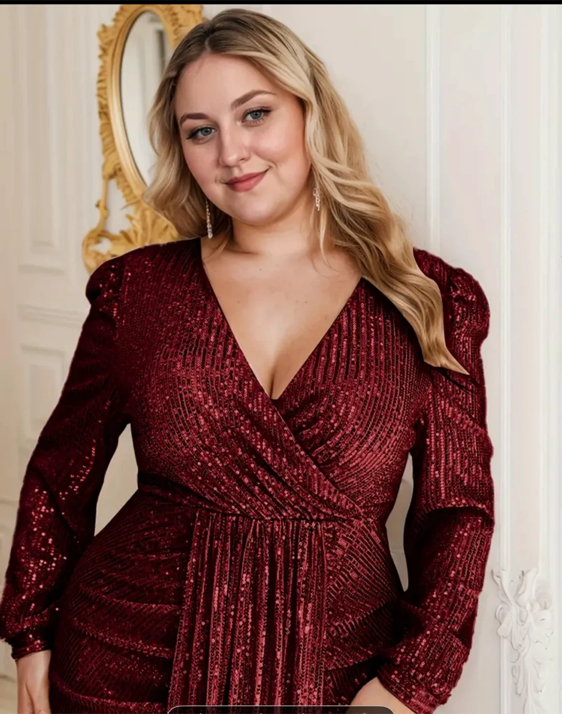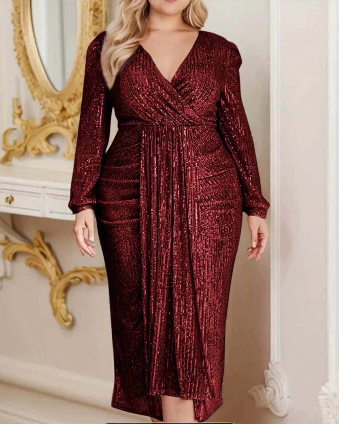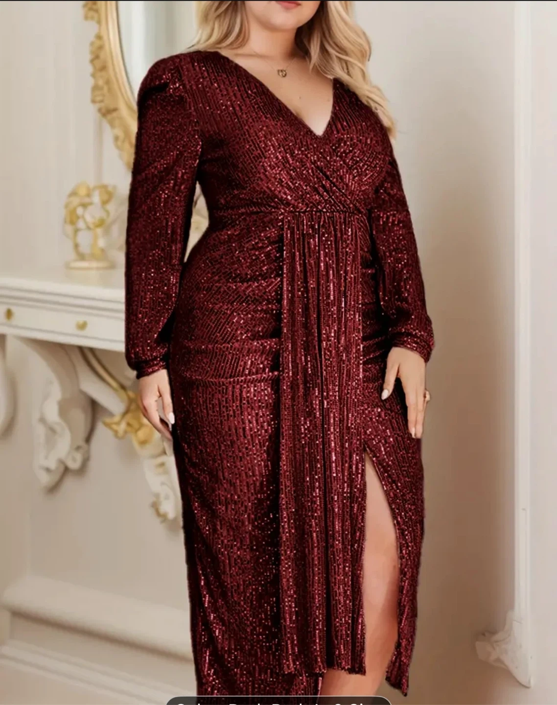 A beautiful burgundy sequin maxi dress! Perfect for a special occasion. It features long sleeves, a V-neck, and a stylish slit