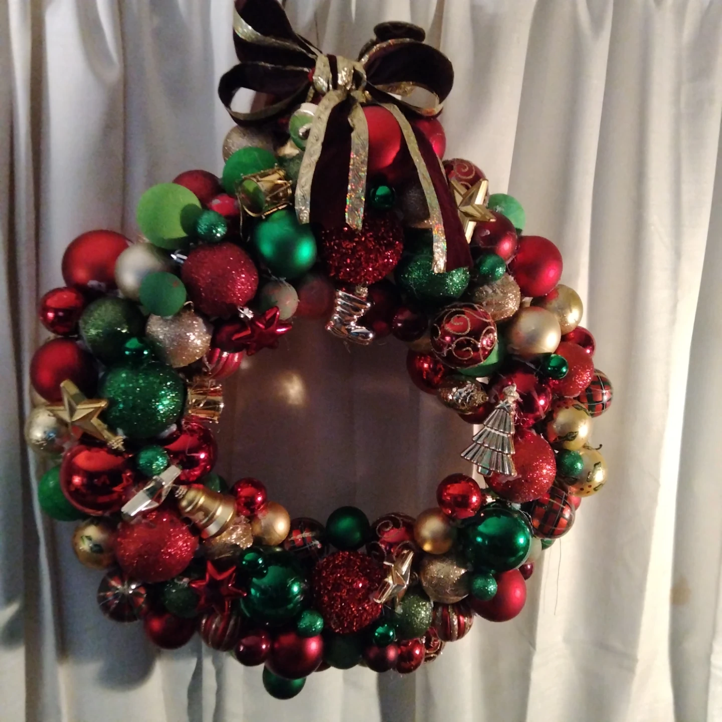Selling a beautiful handmade Christmas ornament wreath! It's perfect for adding a festive touch to your home this holiday season. The wreath is made with colourful ornaments and a decorative bow. Your choice in colour and 100% upcycled.