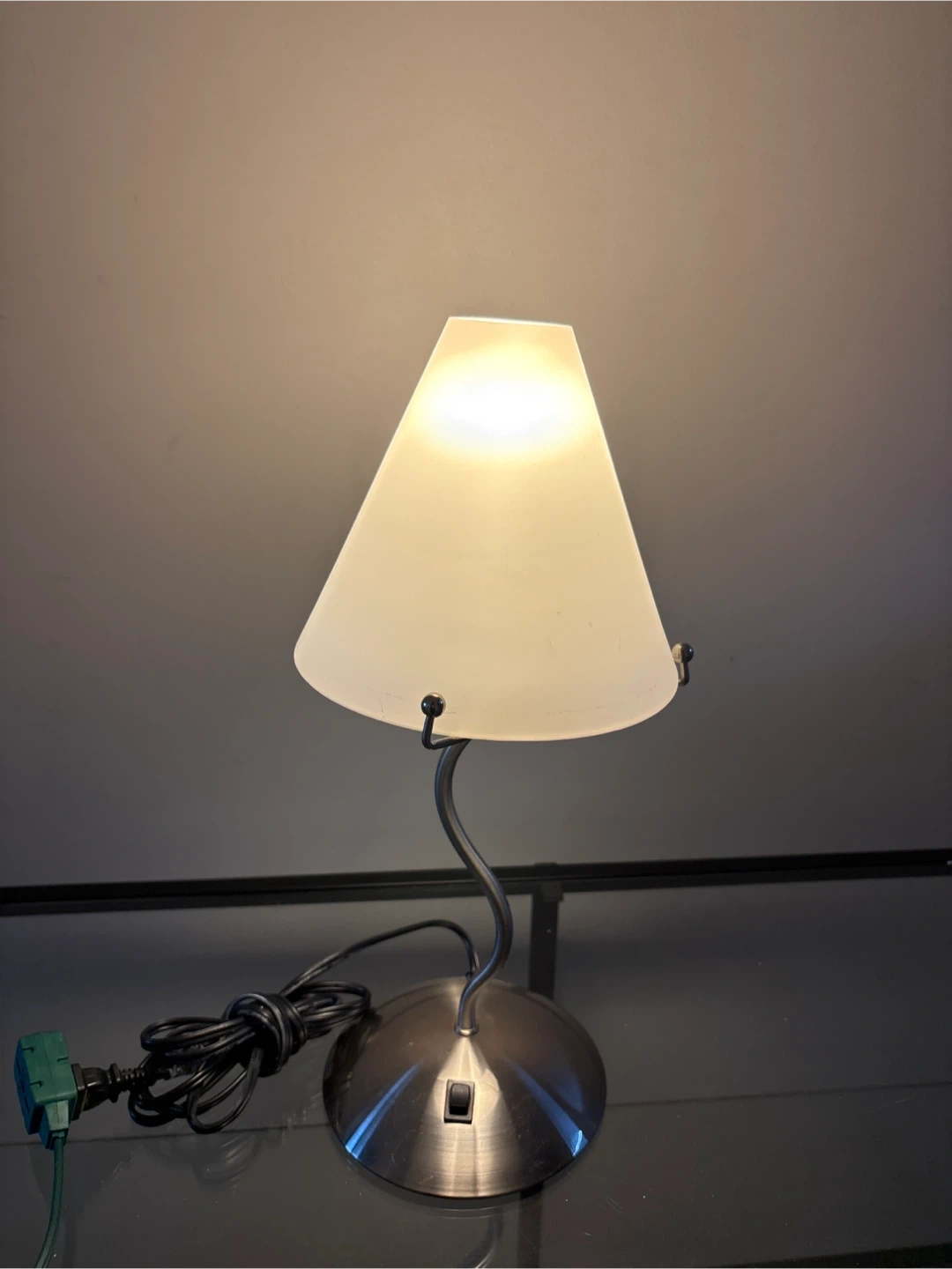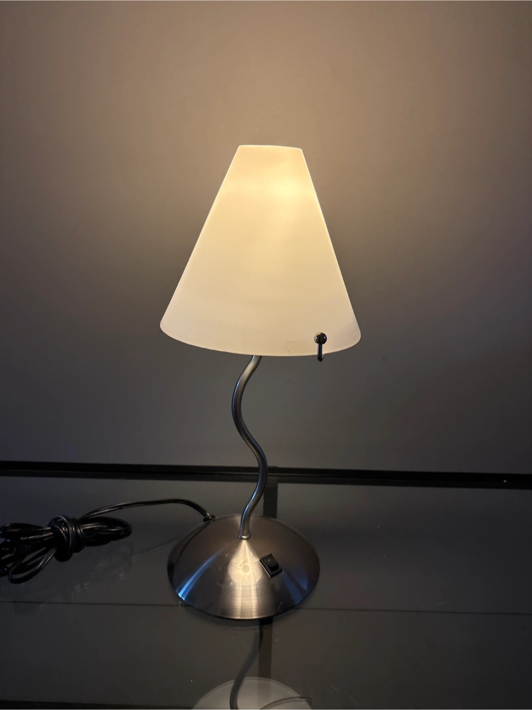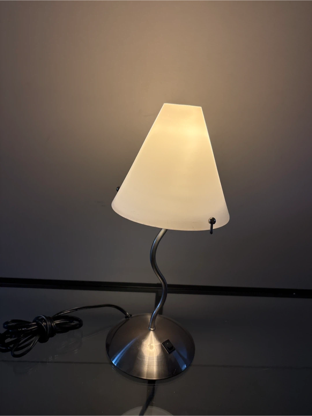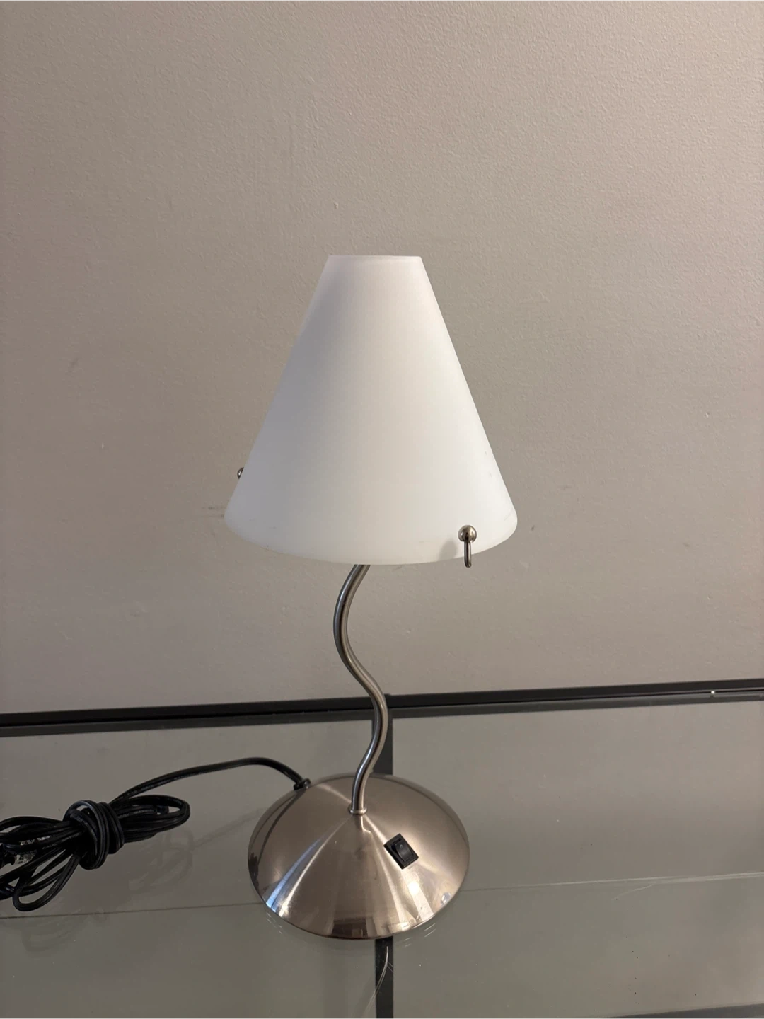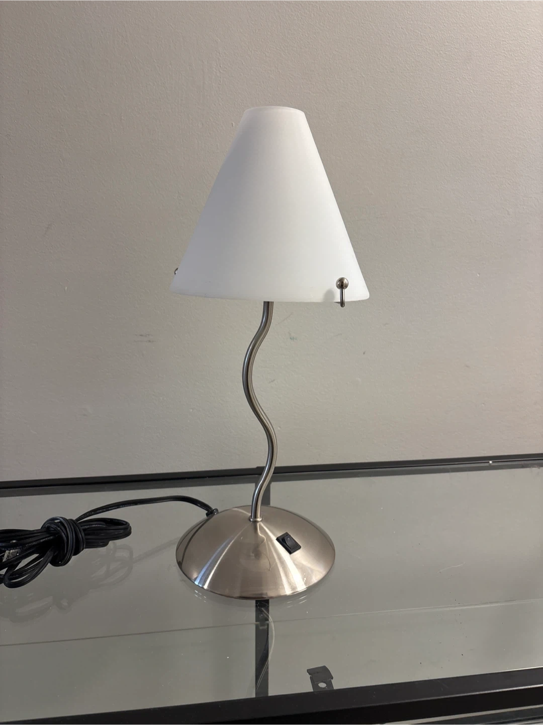 Selling a cute desk lamp! It's in great condition and would look great in any room. It has a white glass shade and a silver base with a switch