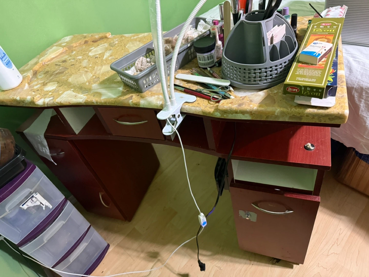 Selling a nail technician desk. It has a marble-patterned top and wood-look drawers. It's in good condition and ready for a new home!