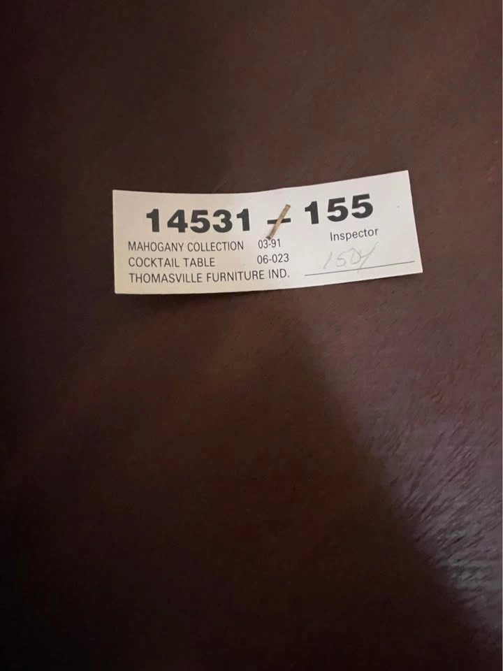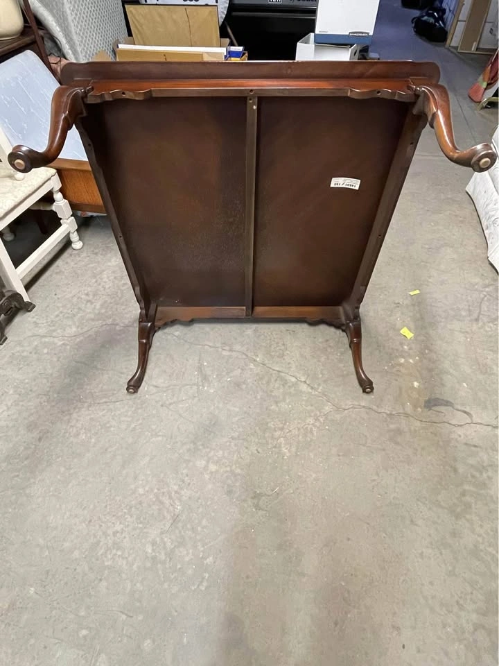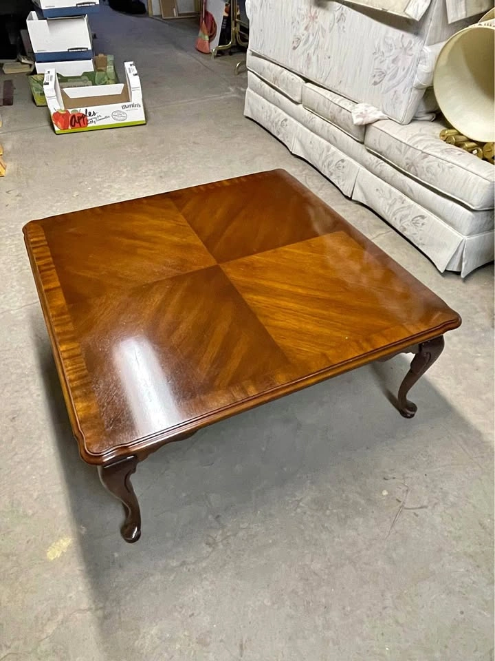 Beautiful table 40” x 40” stands a little over 17” high . Solid wood , from the mahogany collection manufactured in 1991 . Shows some wear on feet and edges . Table top is nice but not perfect . Pick up near the stadium in Hamilton . Thanks
