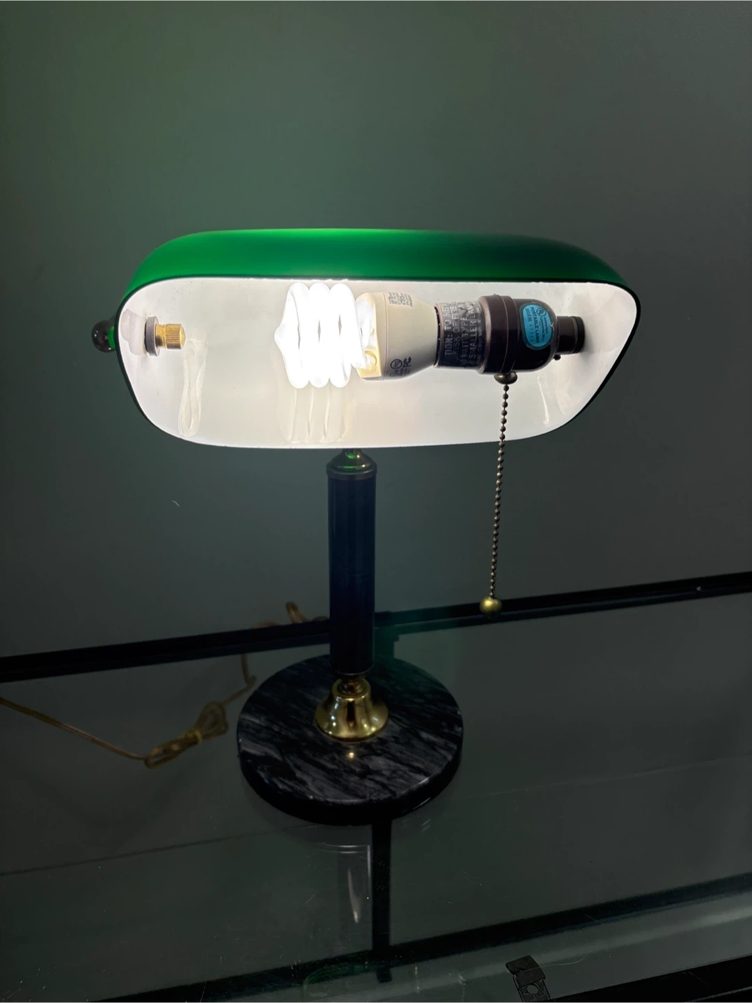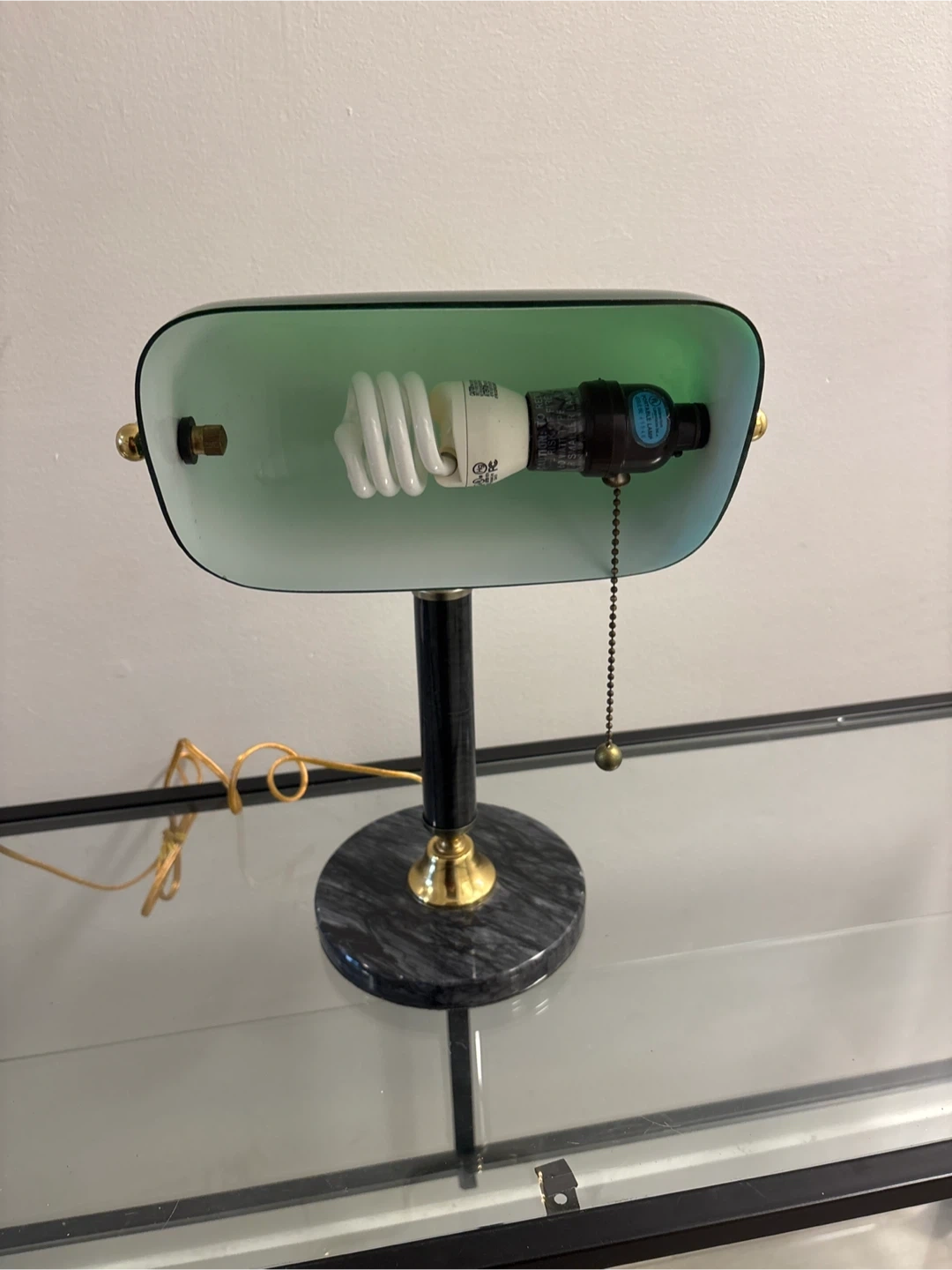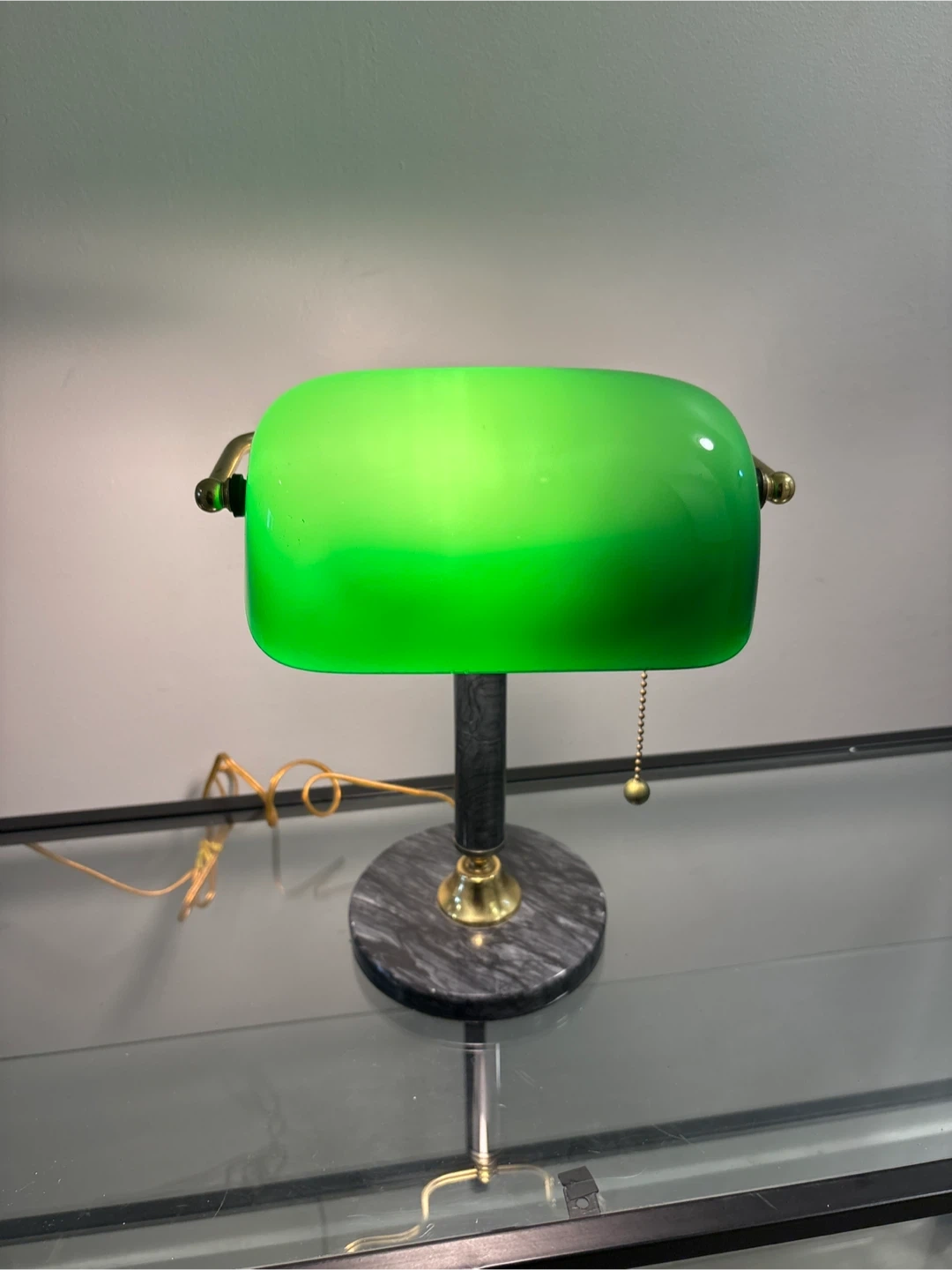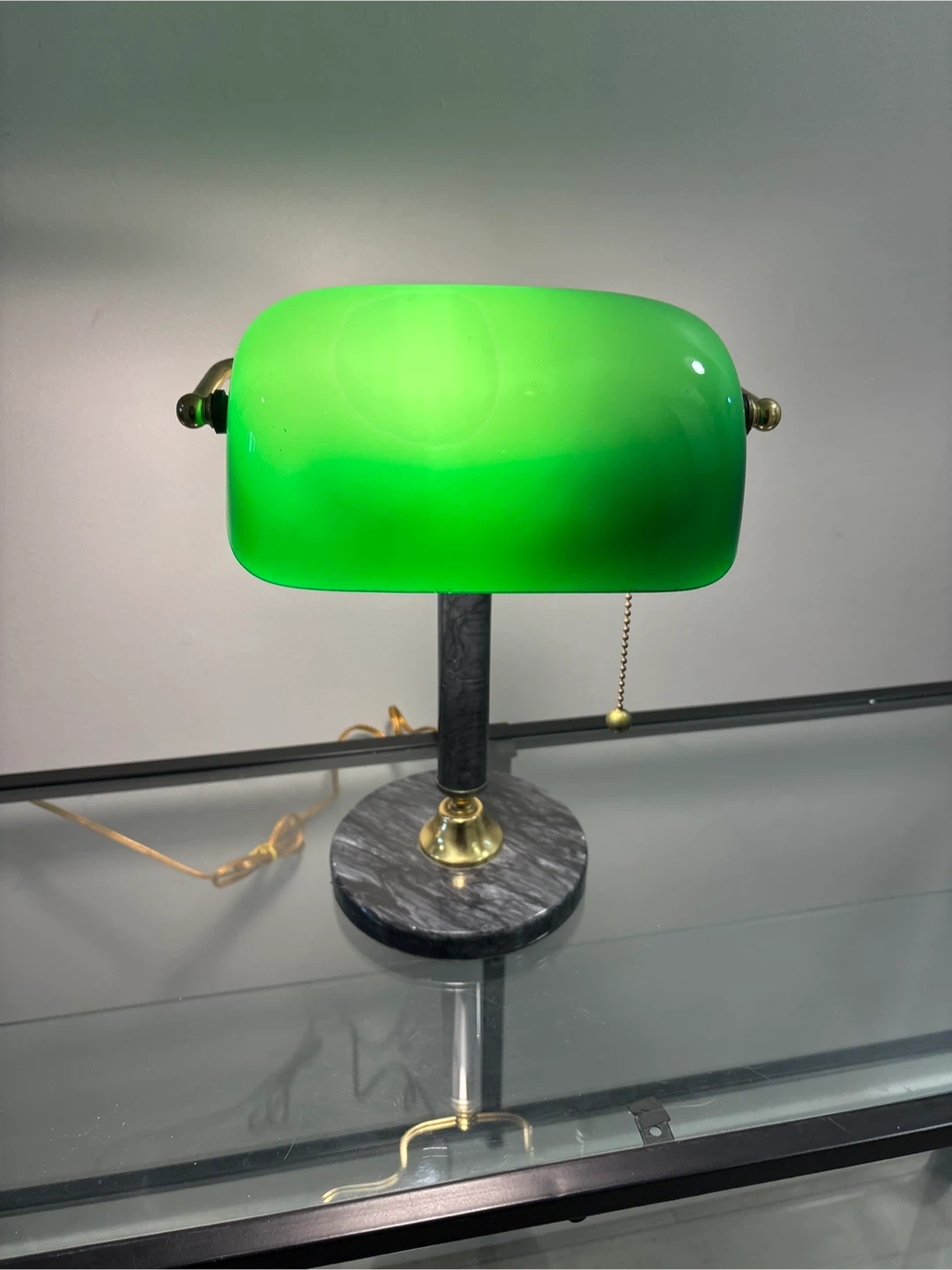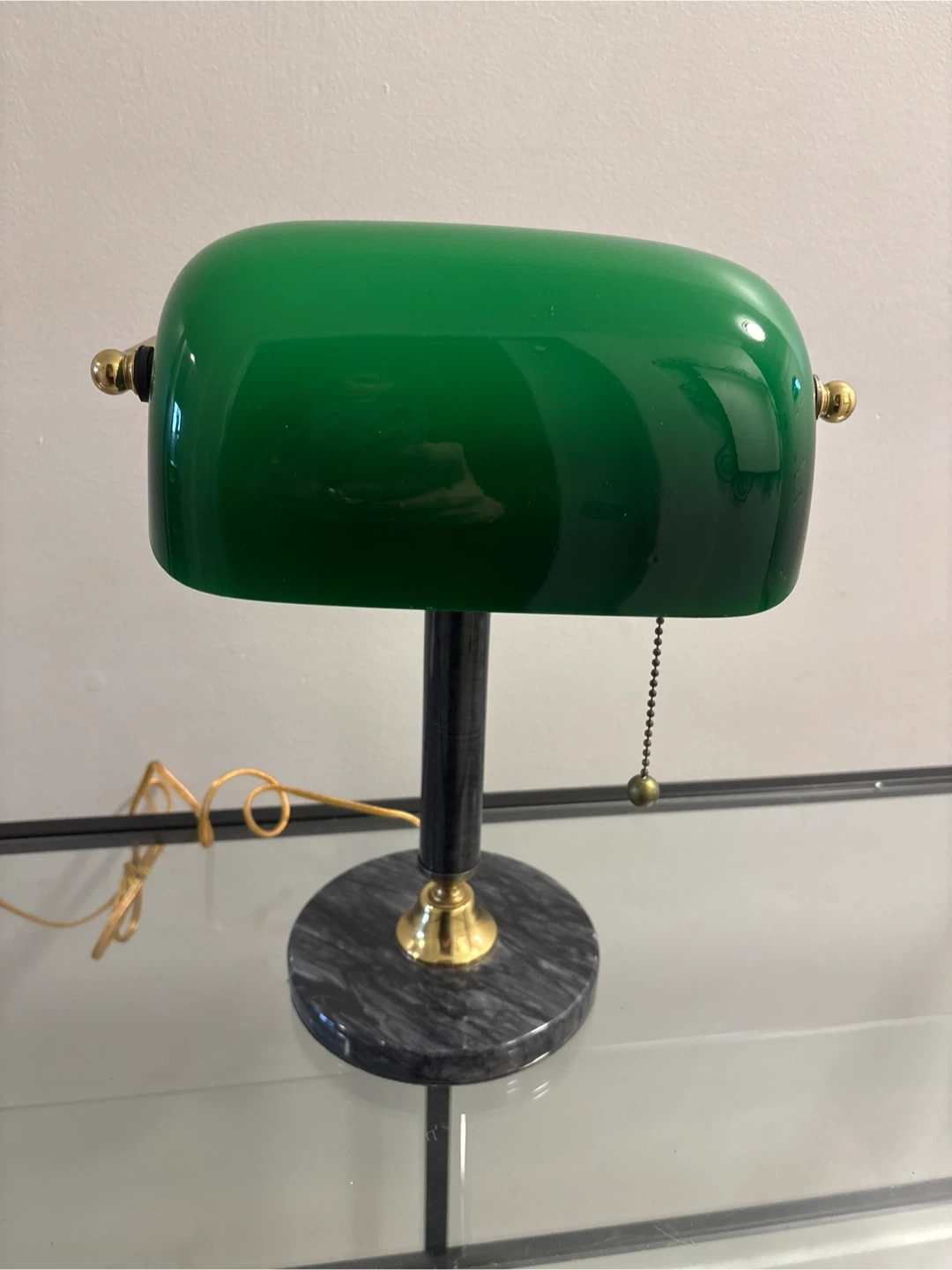 Here's a classic banker's lamp! It features a green glass shade and a marble base. The lamp has a pull chain to turn it on and off. Perfect for a desk or side table!