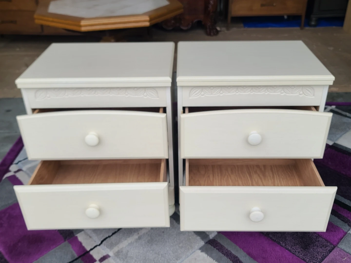A pair of cream-coloured nightstands. They each have two drawers and are in good condition. Perfect for adding a touch of classic charm to your bedroom! Measurements: 21"× 15 1/2"× 25 1/2". Viewing and pickup by appointment. Delivery can be arranged.