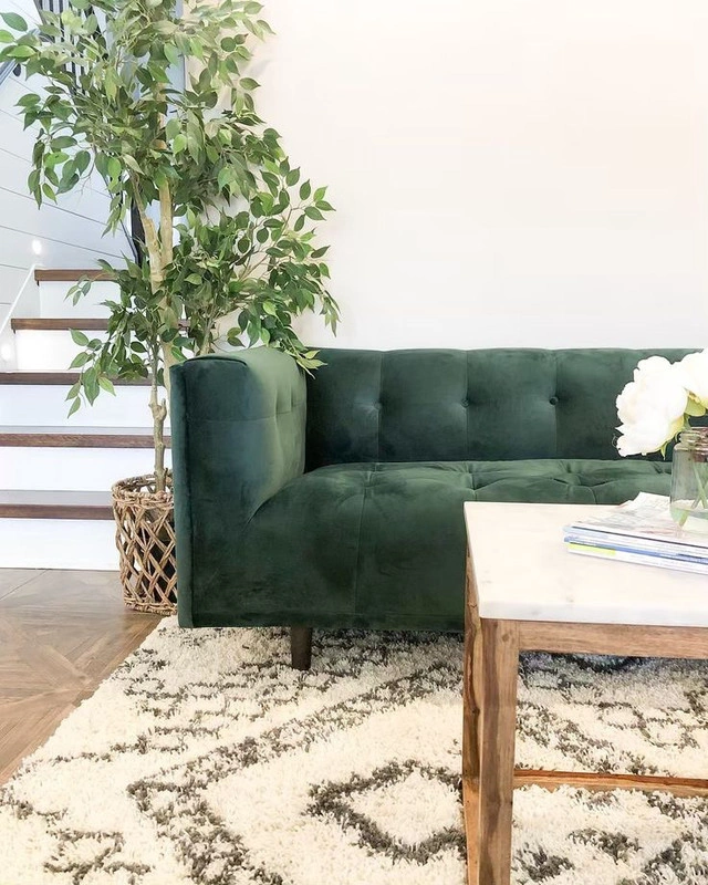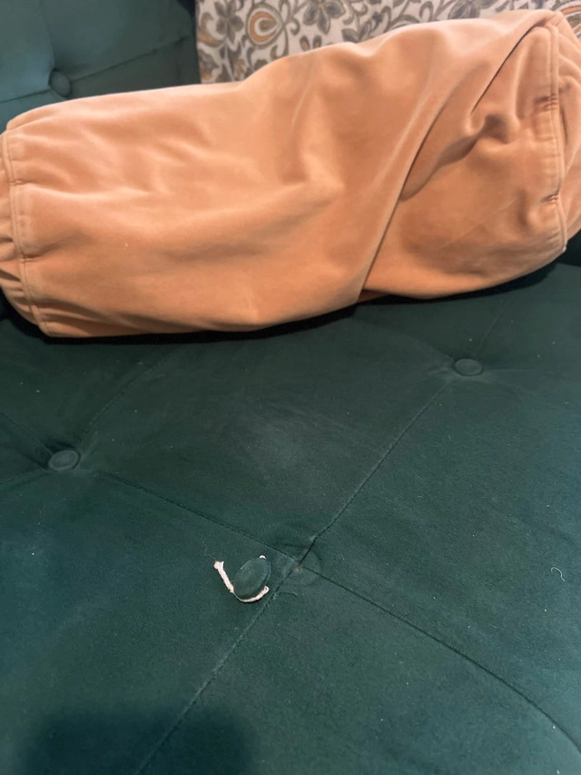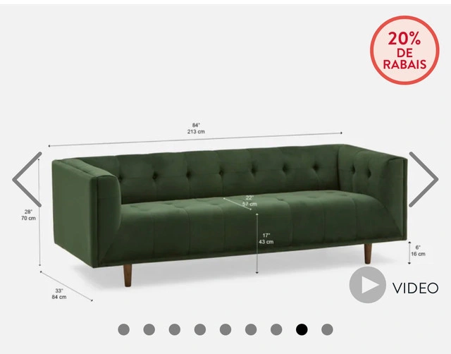 This is a Structube Loretta velvet three-seater sofa, perfect for adding a touch of elegance to any living space. It's in used condition, as there is a small tear, but it's otherwise in great shape and ready for a new home. Here are some of its features: