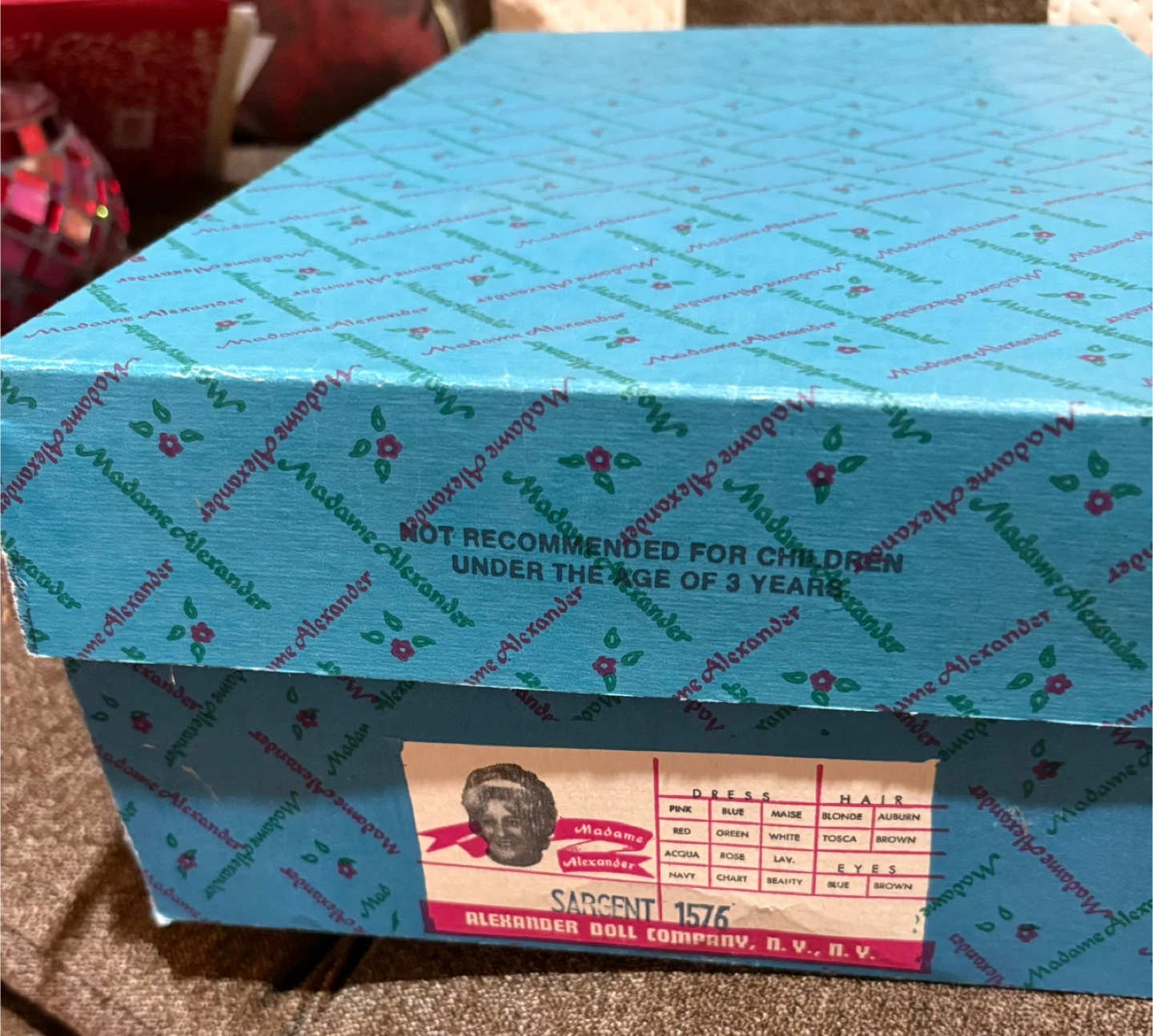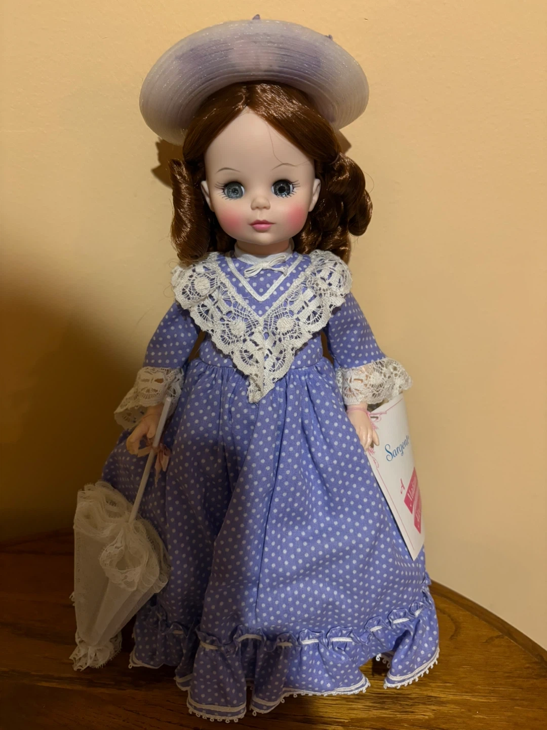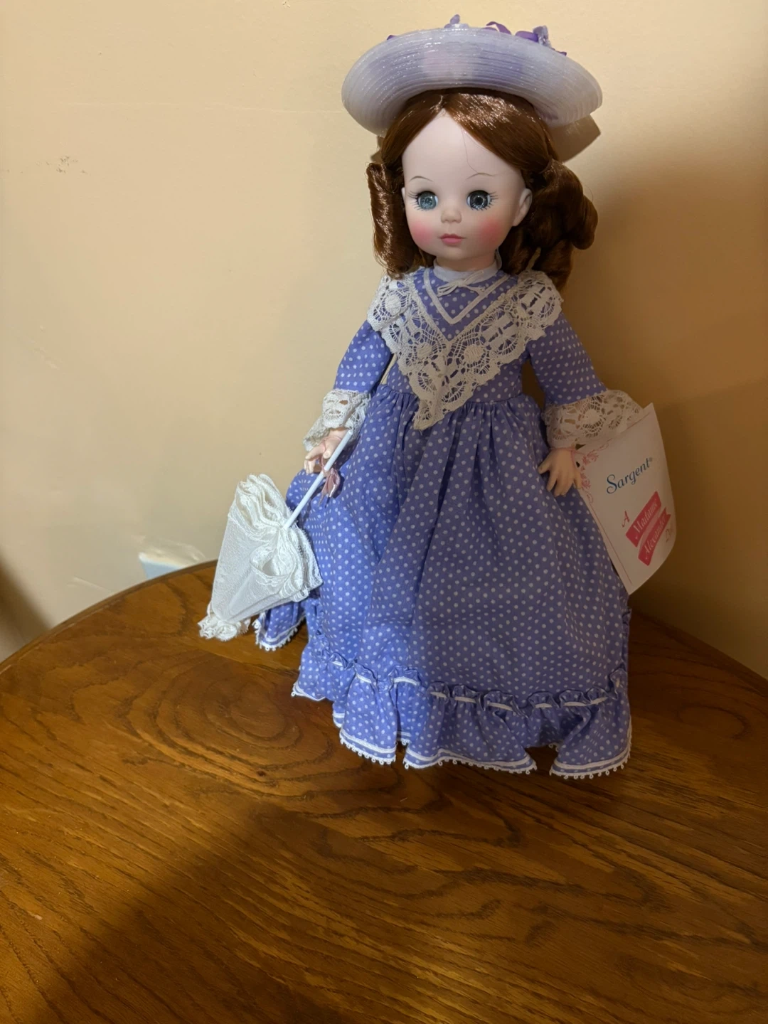 This is a Madame Alexander Doll from the Sargent collection. She is wearing a blue and white polka dot dress with a white lace collar and a matching hat. She also has a white parasol. She is in original box and tag.