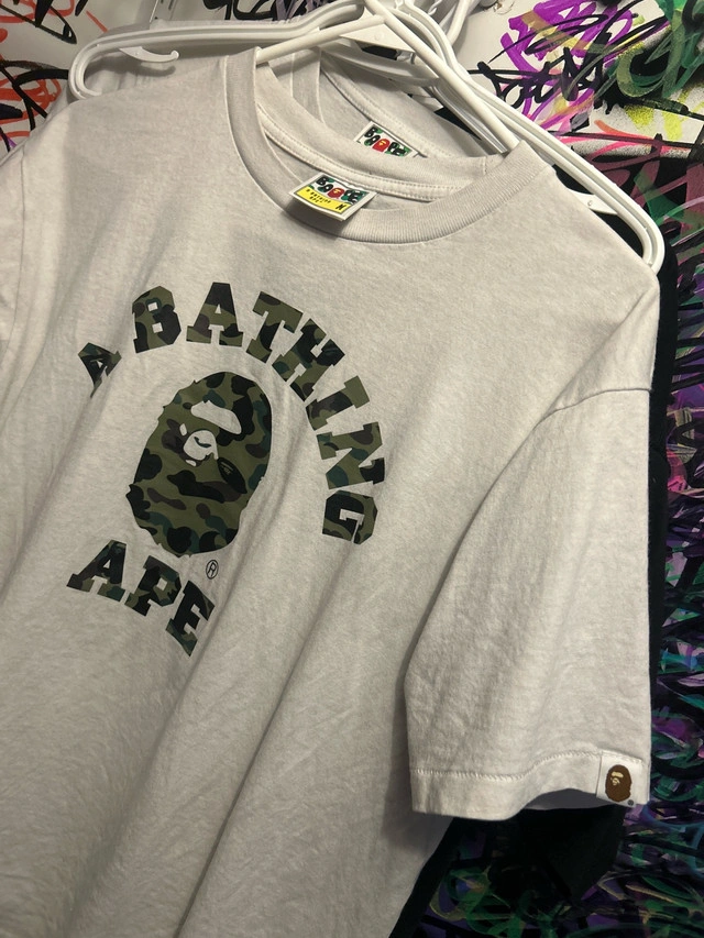 Authentic BAPE tee in white with camo “A Bathing Ape” logo. Size Medium – fits true to size. Good condition, no rips or stains. 100% authentic, from official BAPE drop.