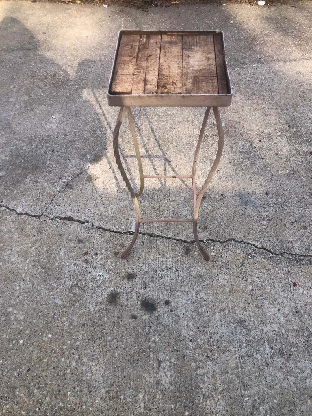 Selling a rustic metal plant stand. It has a square wooden top and a metal frame with a twisted design. Perfect for adding a touch of vintage charm to your home or garden!