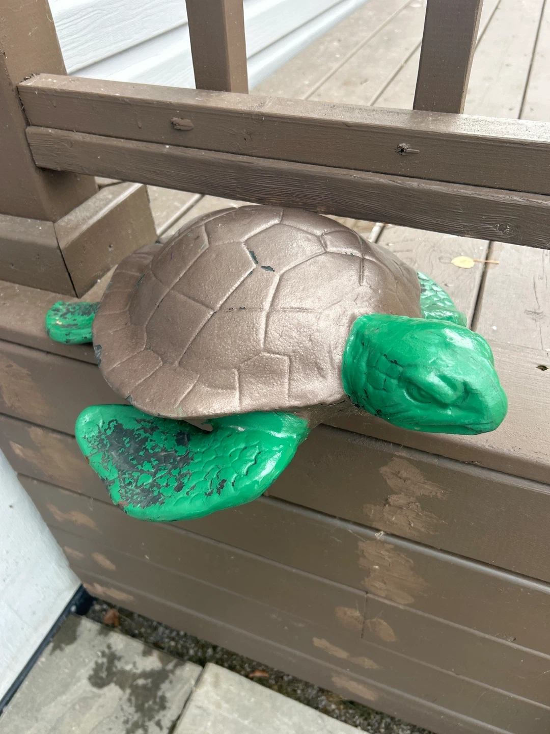 Cute turtle garden statue! It's brown and green, and approximately 11 inches long. Perfect for adding a bit of charm to your outdoor space