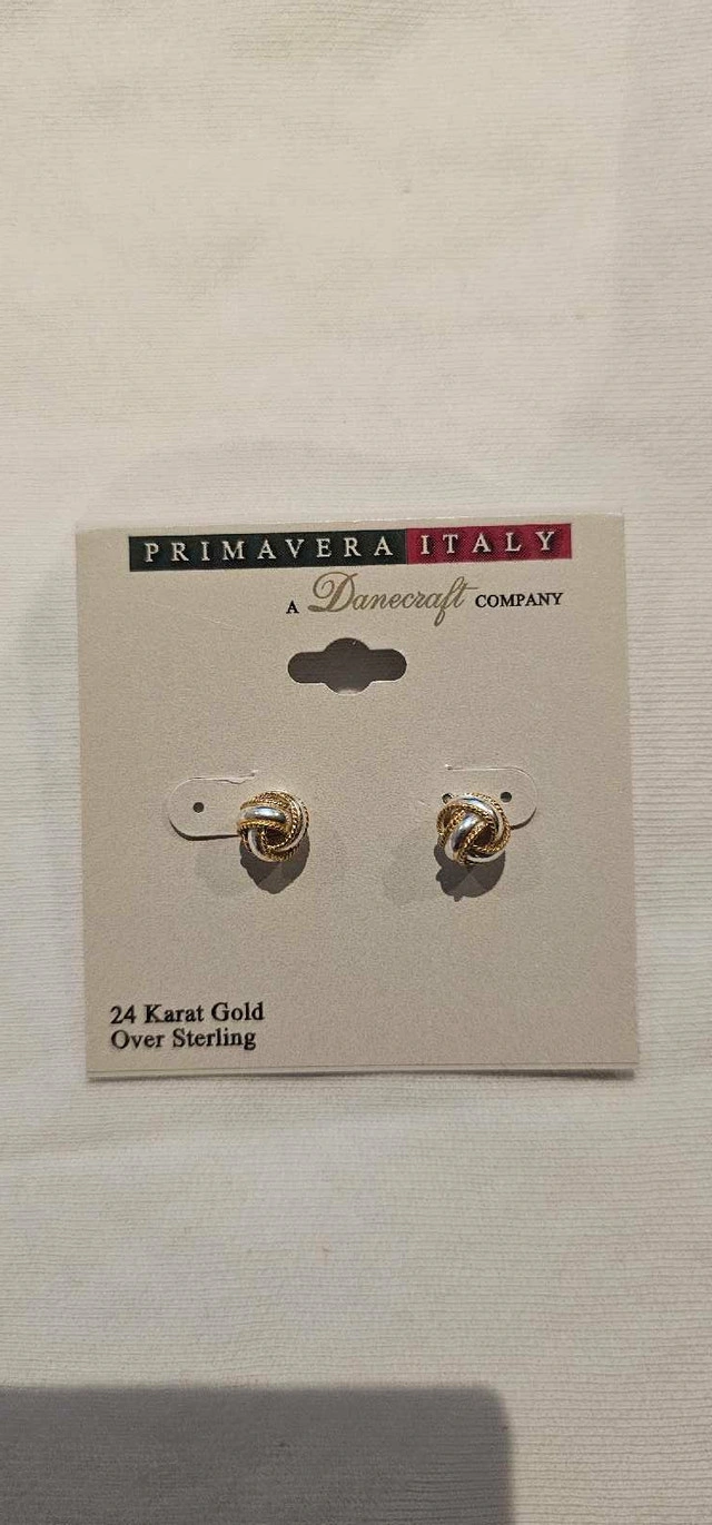 Add a touch of elegance to any outfit with these Primavera Italy 24 Karat Gold Over Sterling Silver Knot Stud Earrings. These earrings are in new condition, still on their original card, and ready to wear or gift. Here are some additional details:
