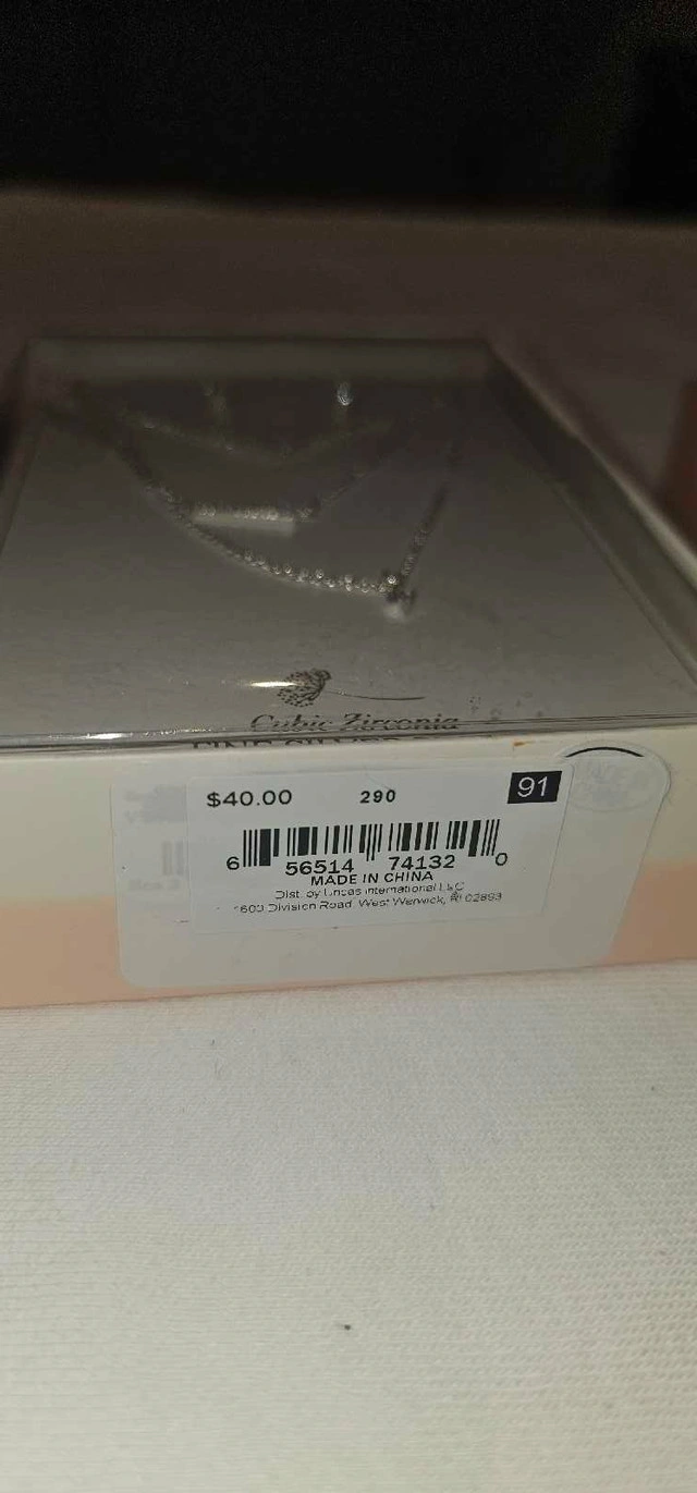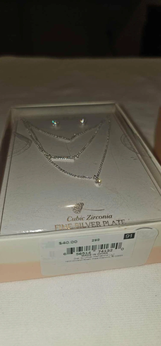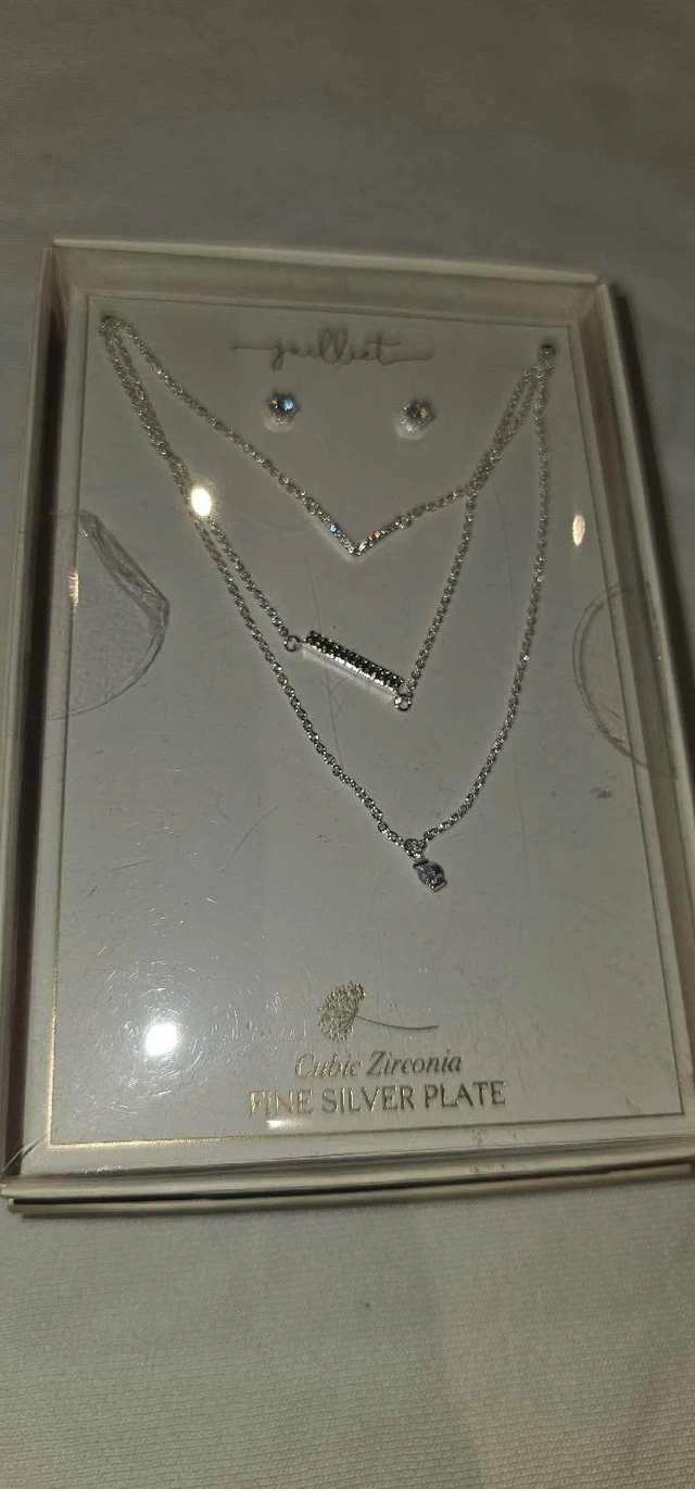 Add a touch of sparkle with this new Jewellet necklace and earring set, featuring cubic zirconia on a fine silver plate. This elegant set includes a layered necklace and matching stud earrings, perfect for adding a subtle shimmer to any outfit. Unfortunately, I am unable to provide specific measurements or stone sizes, but it is a standard size. If you're reading this, it's still available—ready to bring some sparkle to your day!