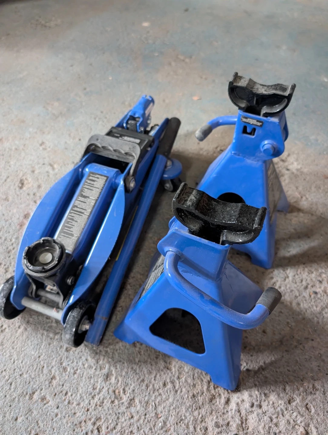 Selling a blue hydraulic floor jack and a pair of axle stands. They're in good working condition and ready to help with your car maintenance needs.