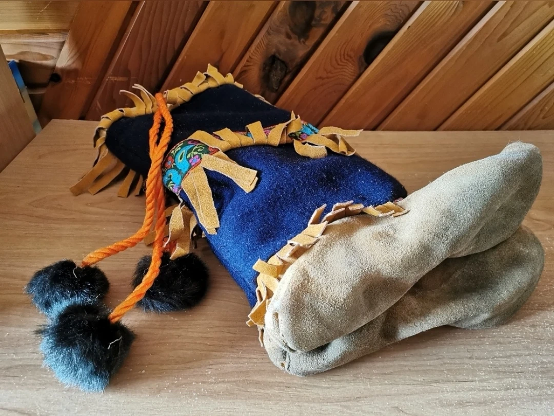 Beautiful Native American Floral Artwork, fringe on the sides and soft wool line in the inside. They are in great pre-owned condition, clean, warm, will fit size L/XL (size 38-40), about 13 inch tall.