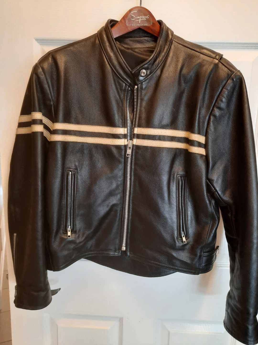 15Classic custom made at "On the Fringe" Toronto, black leather motorcyle jacket in great condition. It features a retro design with stripes across the chest and back. Perfect for adding a cool edge to any outfit!