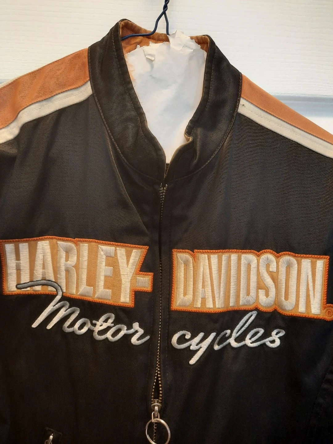 15Ladies cloth Harley-Davidson motorcycle jacket, perfect for showing off your love for bikes! The jacket features the Harley-Davidson logo embroidered across the front. It's in great condition and ready for a new owner!