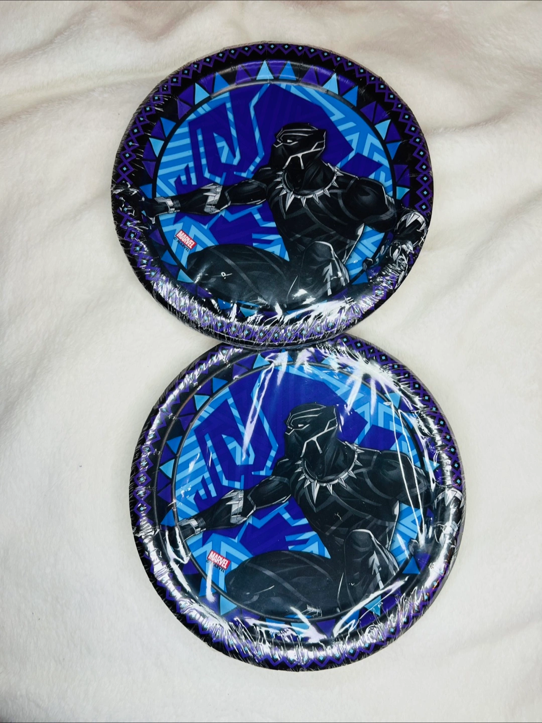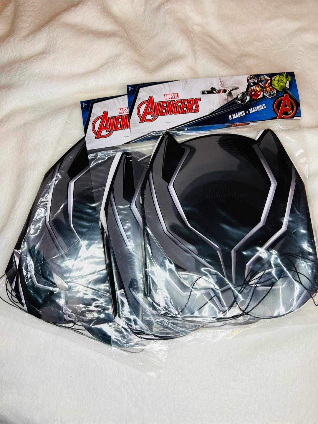 Selling a set of Marvel Avengers Black Panther themed party supplies! Includes a tablecover (54 in x 84 in), 24 masks, and 16 plates. Perfect for a kids birthday party or any Avengers fan!
