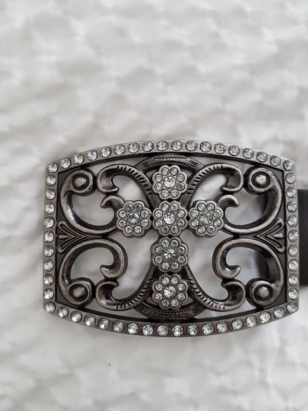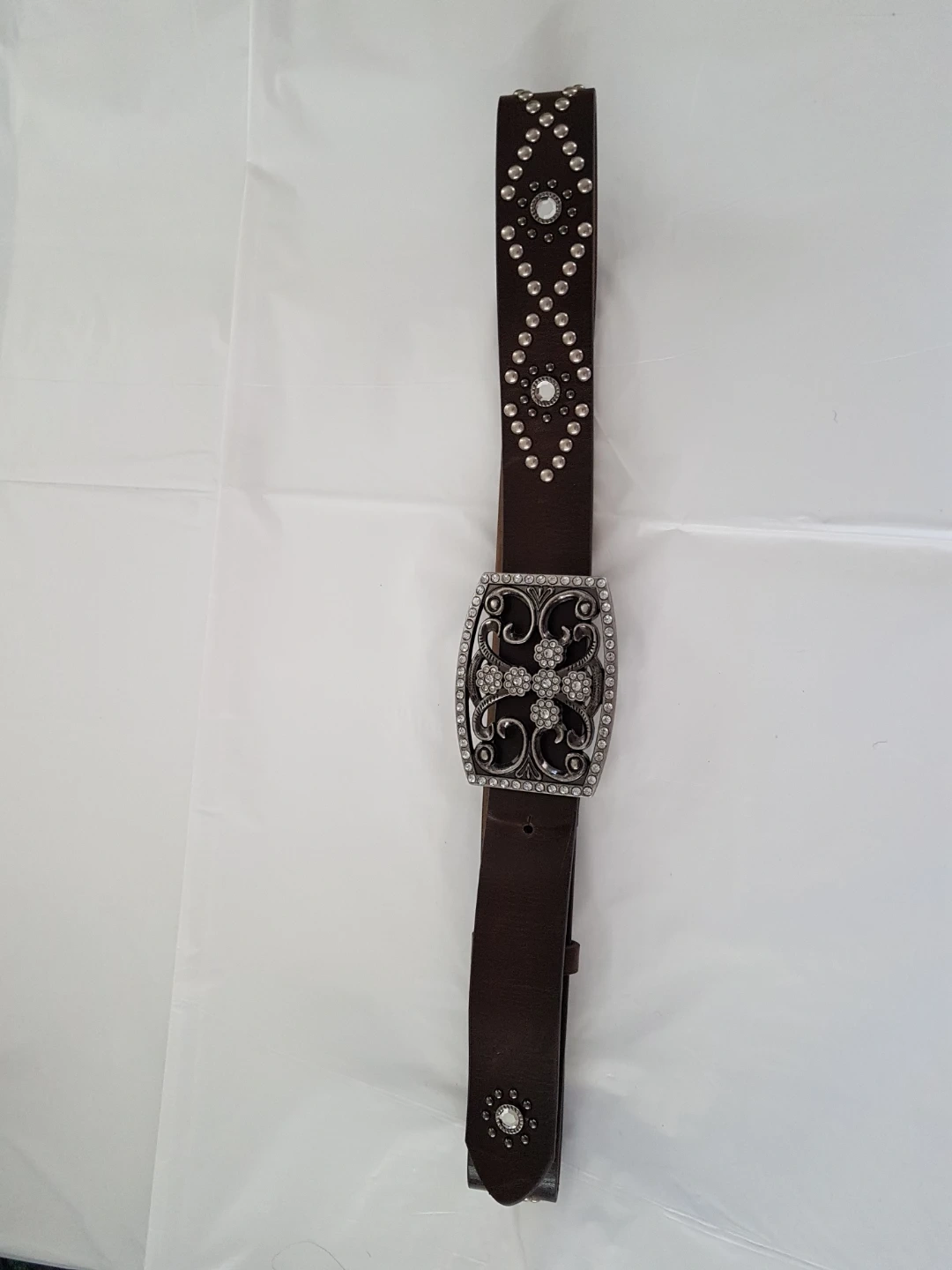 Selling a Guess belt in brown. It's a size large and made of manmade materials. The buckle has a unique design with some decorative stones!