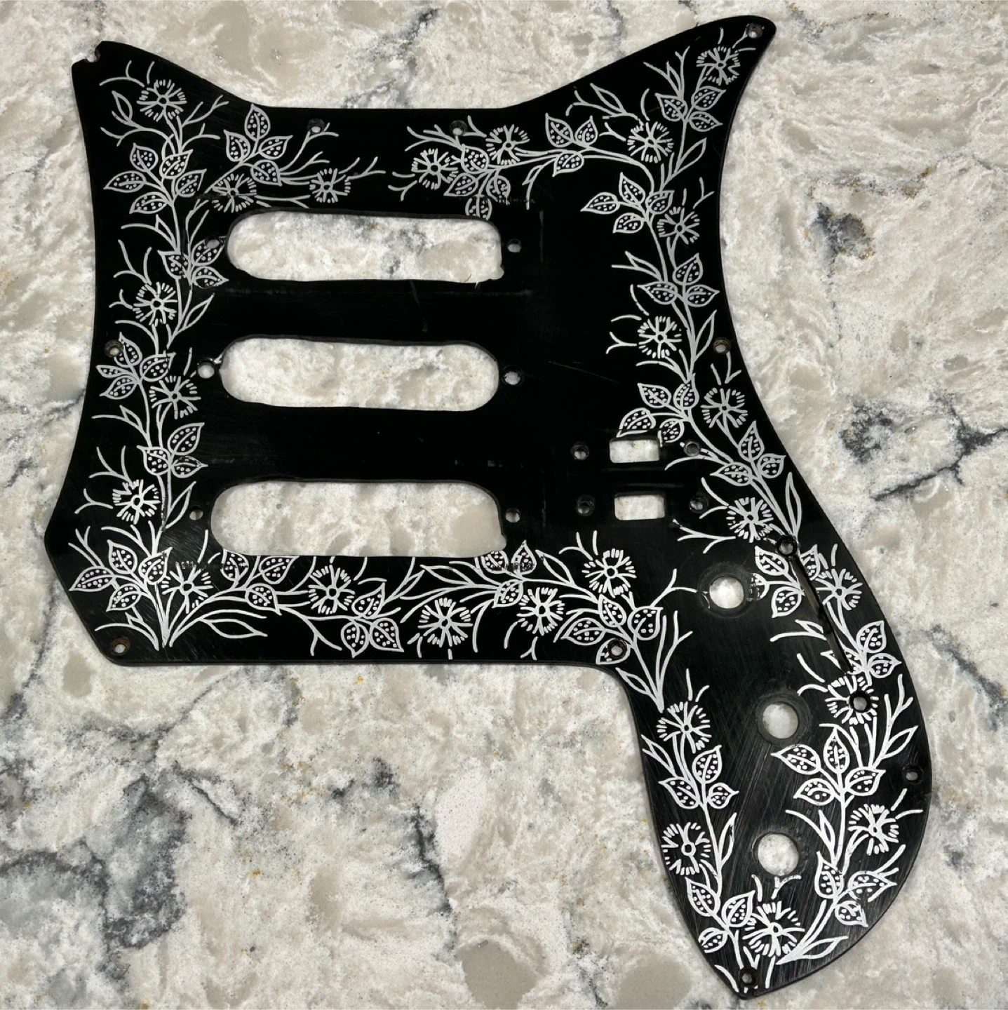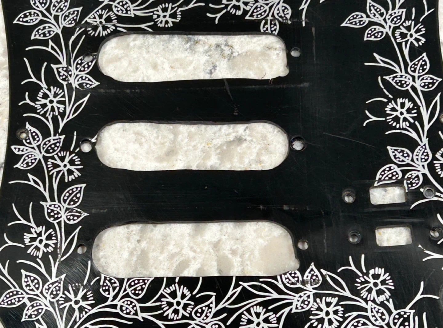 Pickguard with a unique black and white floral design.