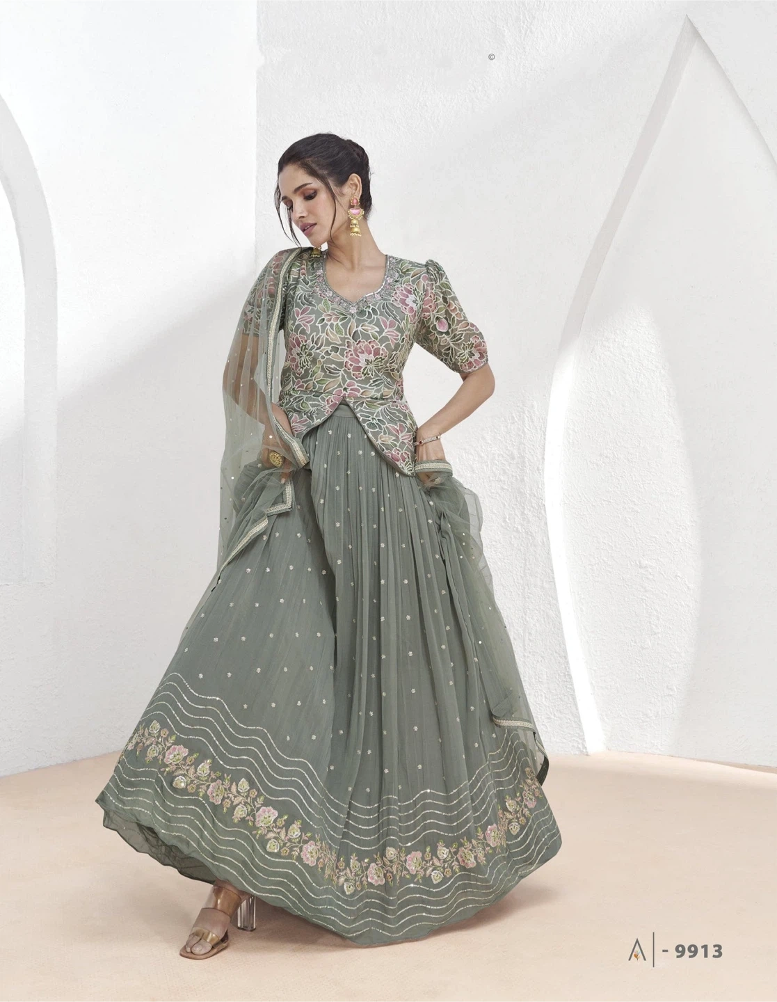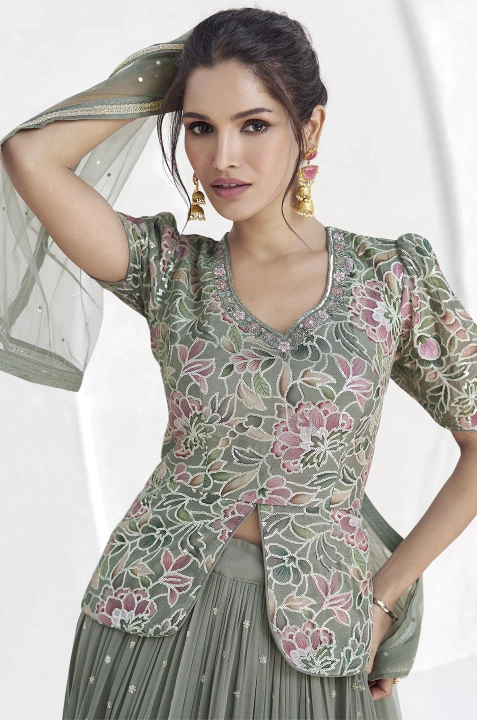 Beautiful floral embroidered lehenga choli set, perfect for a special occasion! The set features a stylish top with floral embroidery and a matching lehenga skirt with delicate details. The colour is a lovely muted green. Great for weddings or parties!