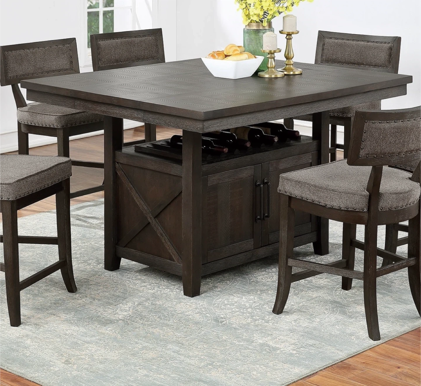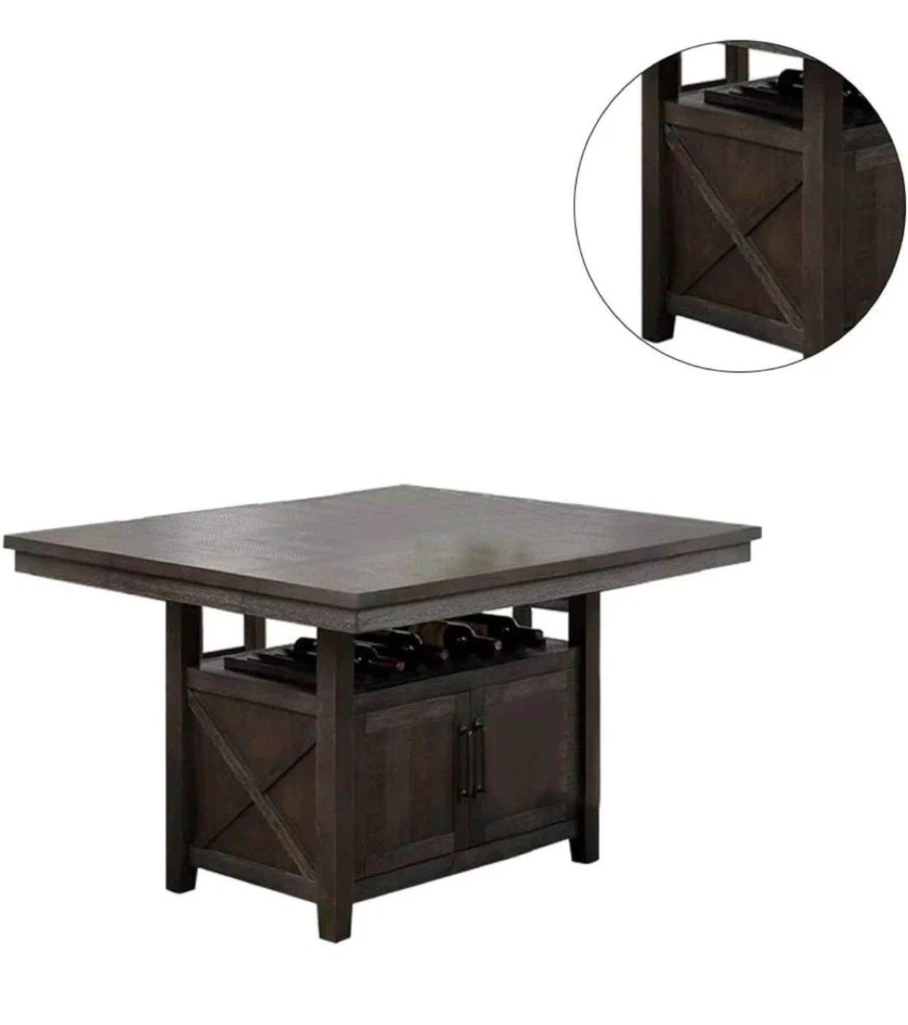 This counter height extendable dining table is perfect for a smaller space! It features a built-in wine rack & storage cabinets, adding both style and functionality. This product comes with 4 chairs (optional).