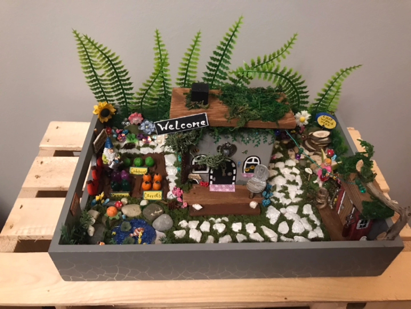 Check out this charming handmade fairy garden display! It features a cute little house, miniature vegetables, and whimsical decorations. Perfect for adding a touch of magic to any space