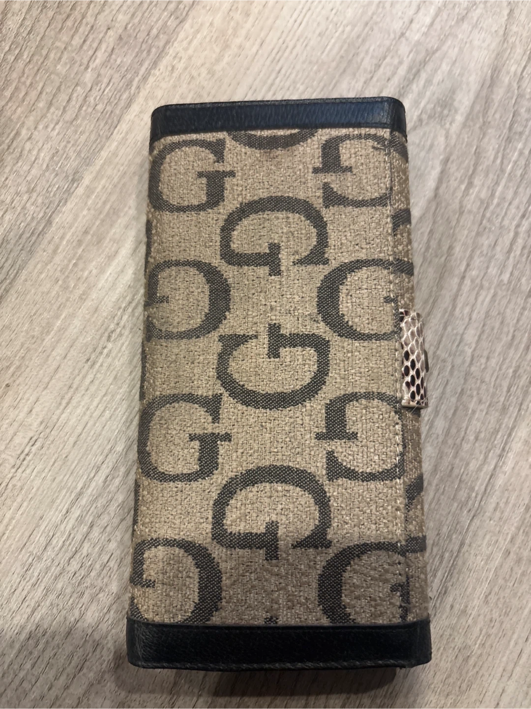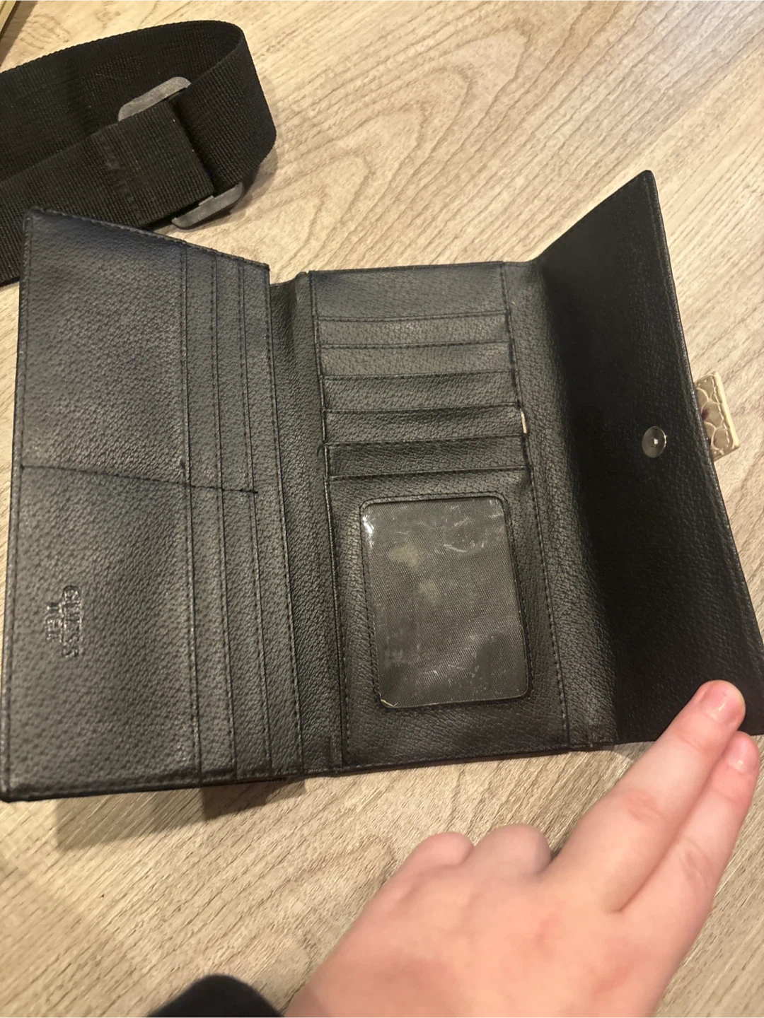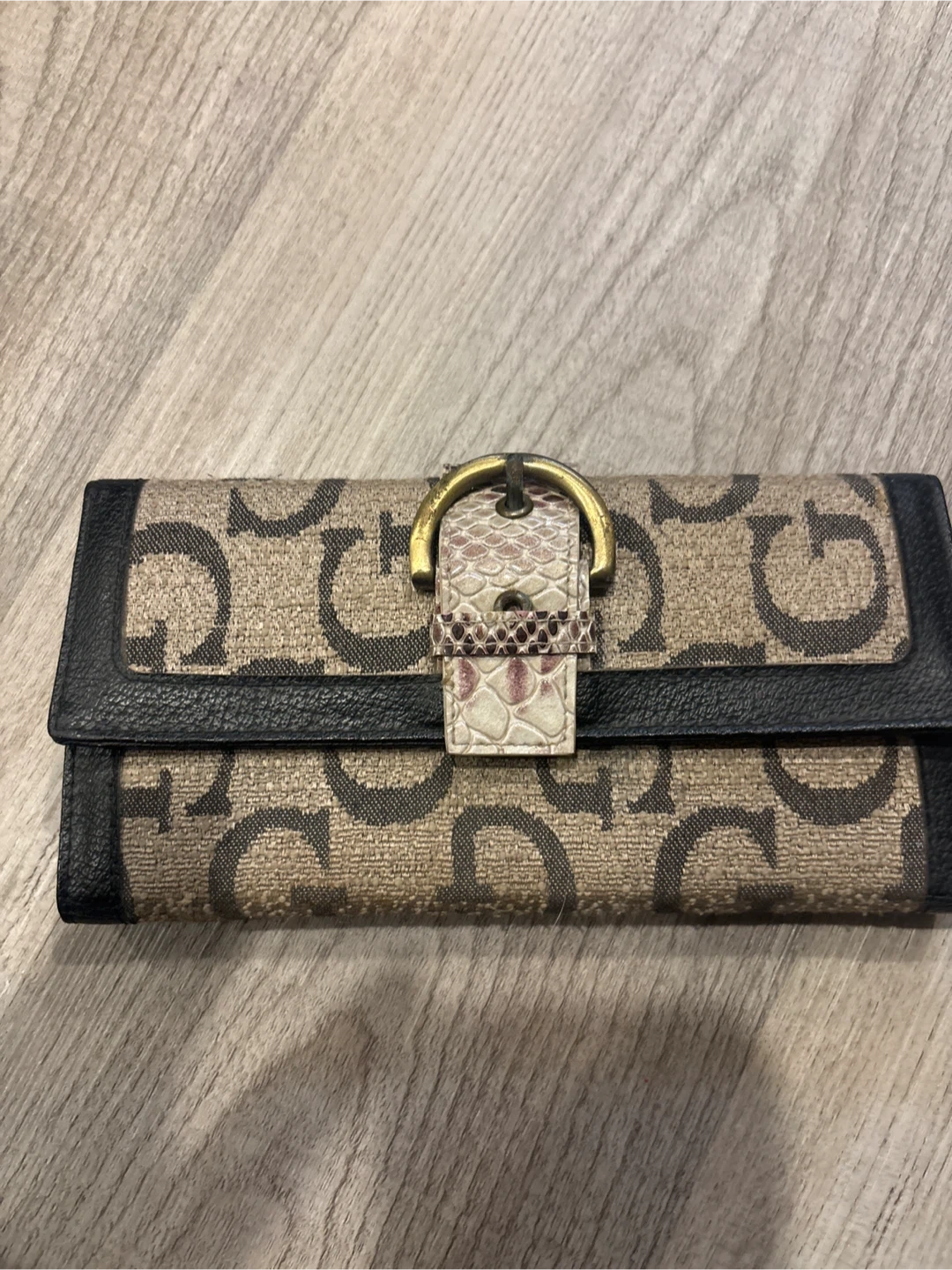 Selling a Guess wallet! It has a unique pattern and a buckle detail. Inside, there are plenty of slots for cards and a clear window for ID. It's in good condition and ready for a new home