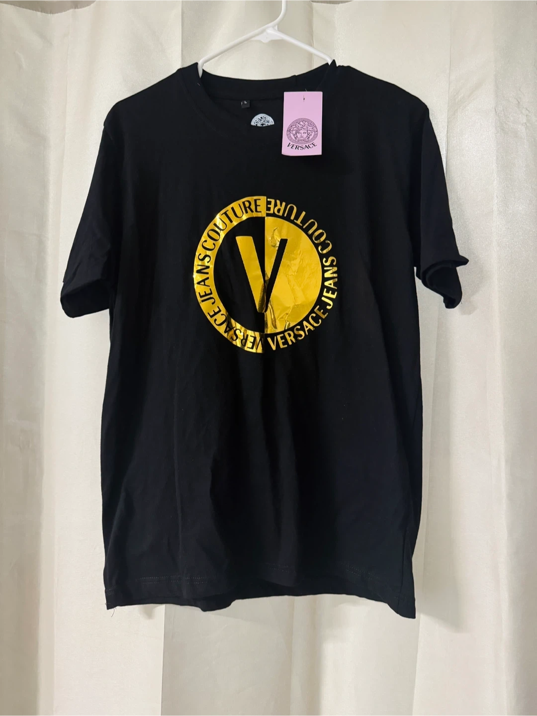 Selling a Versace Jeans Couture T-shirt in black. It features a large gold 'V' logo. The size is L. It's in great condition and ready for a new home! Its unisex
