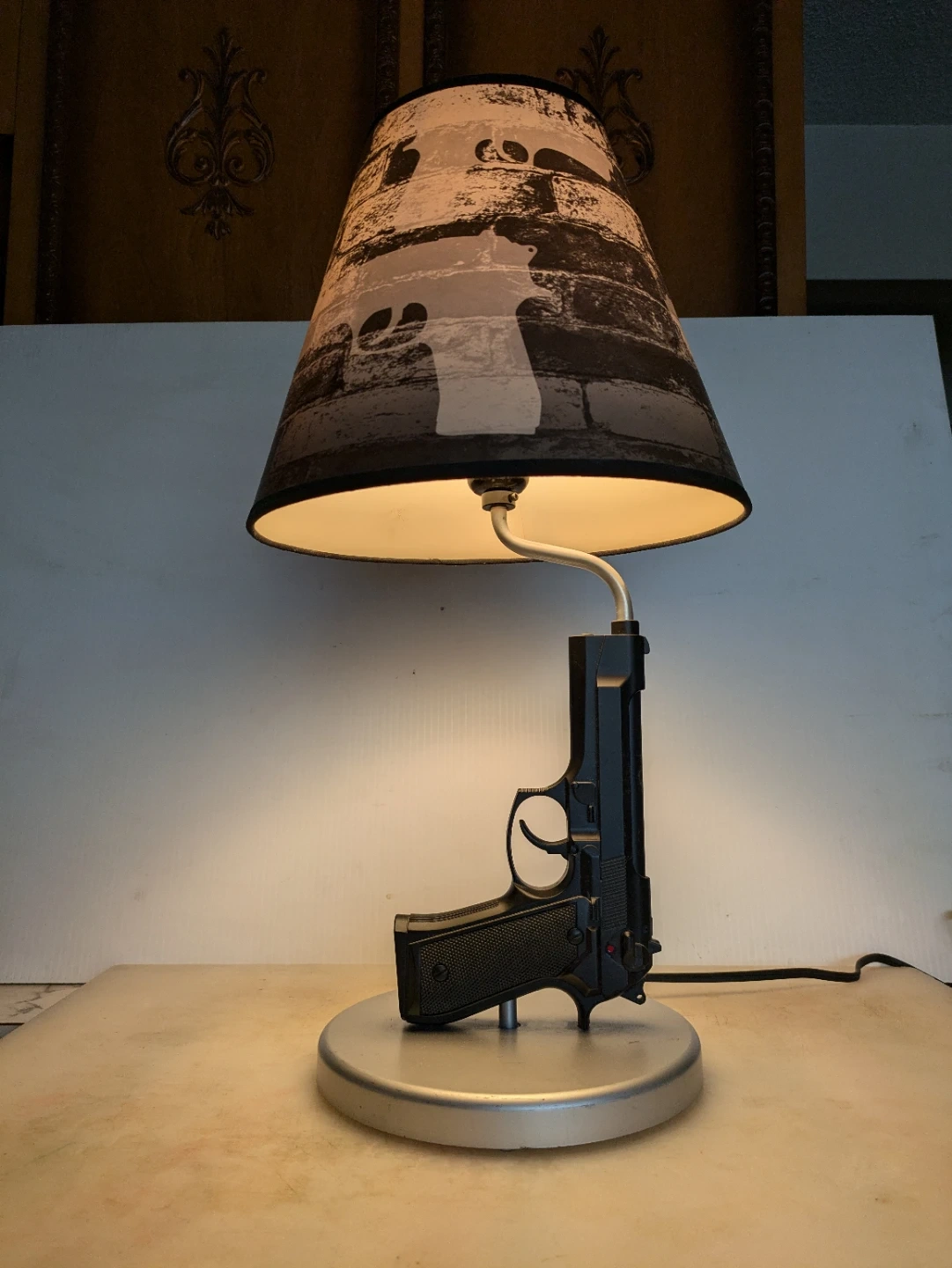 Gun table lamp in excellent condition . I believe the gun is made of resin . Works great . Cash payment please , thanks for looking .