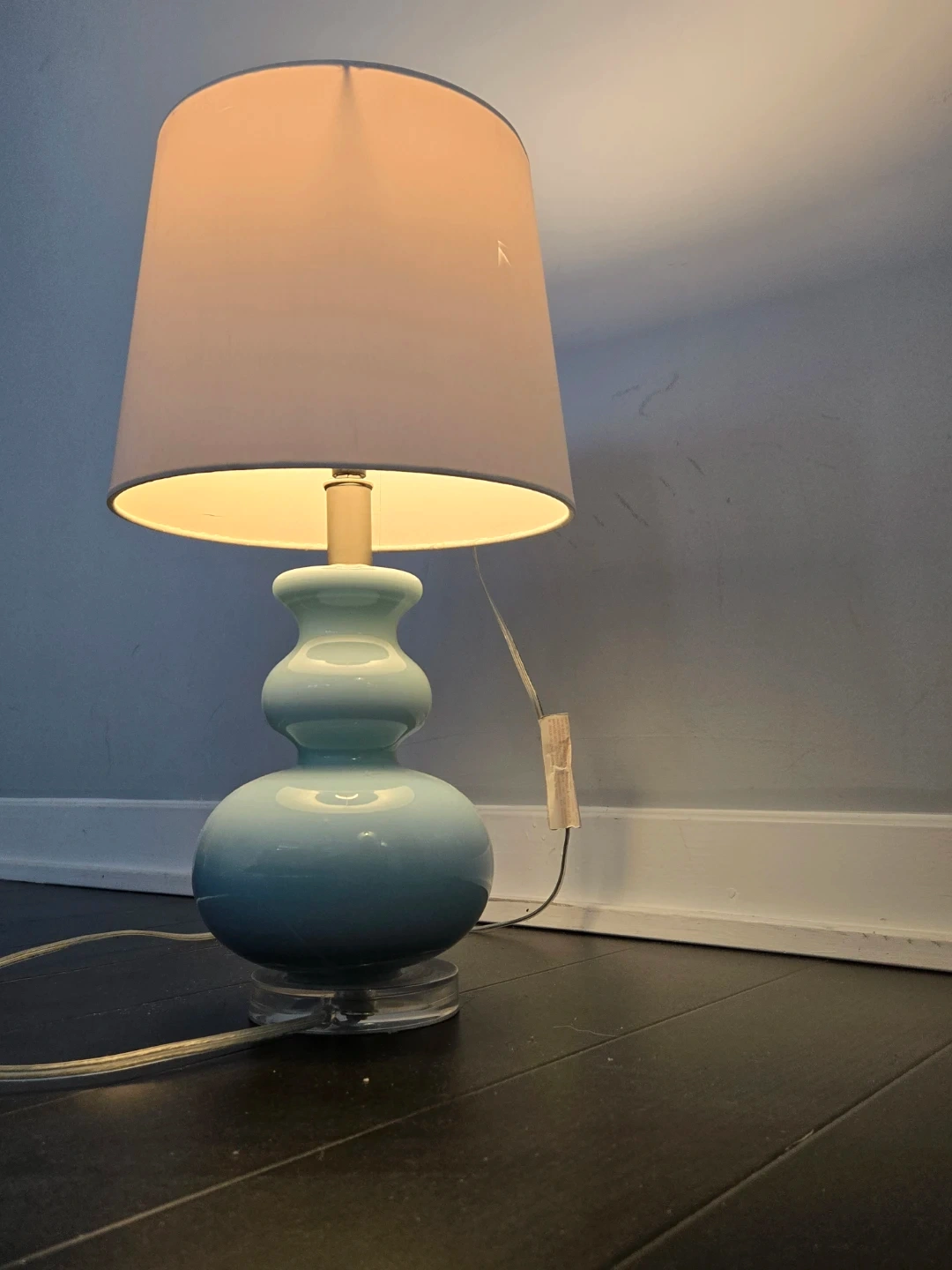 This is a lovely blue ceramic table lamp that would look great in any room! It has a classic design with a slightly modern feel. The base is a beautiful light blue ceramic, and the shade is a neutral colour that complements the base perfectly. It's in great condition and ready to brighten up your space