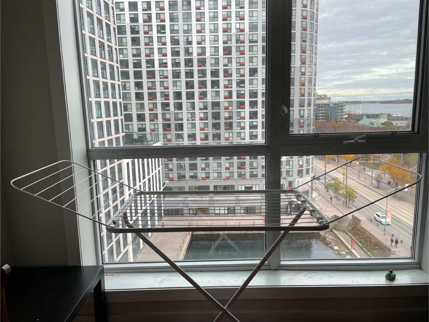 Selling a clothes drying rack in white. It's in great condition and ready to help you save on dryer costs! The rack measures about 67cm wide.