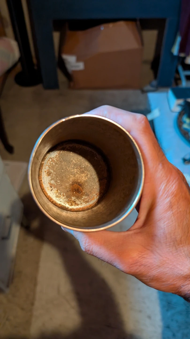 Selling a metal cup with a unique pattern. It shows some signs of use, as pictured.