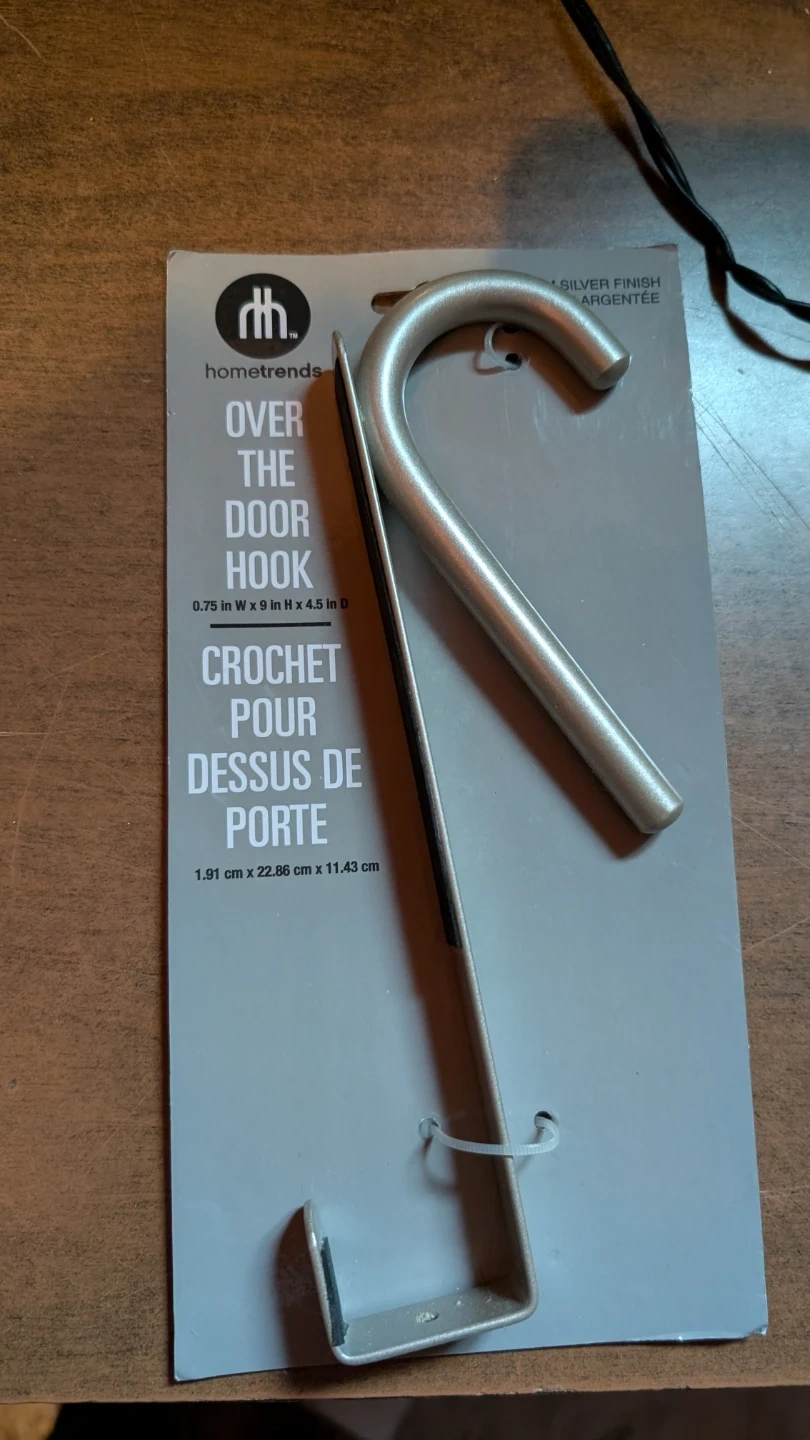 273Selling a hometrends over-the-door hook in a warm silver finish. It's brand new and still in its original packaging. The hook measures approximately 0.75 inches in width, 9 inches in height, and 4.5 inches in depth (1.91 cm x 22.86 cm x 11.43 cm). Perfect for adding extra hanging space!
