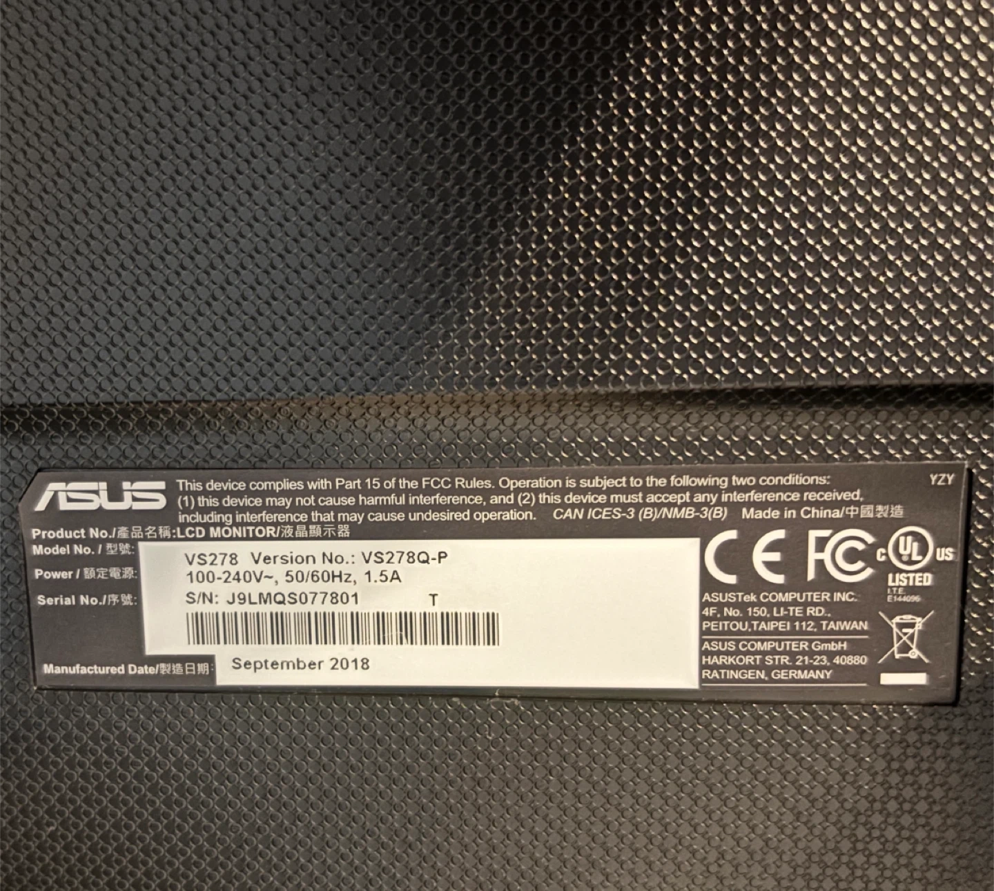 Selling an ASUS VS278Q-P 27" LCD monitor. The manufacturing date is September 2018. Works fine .. just has a very slight scratch on screen. Data and power cables included.