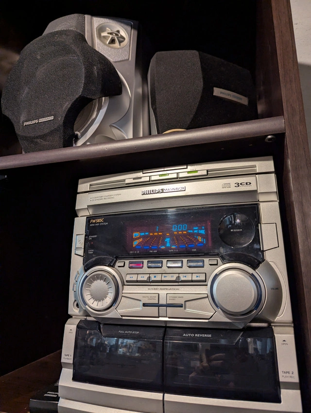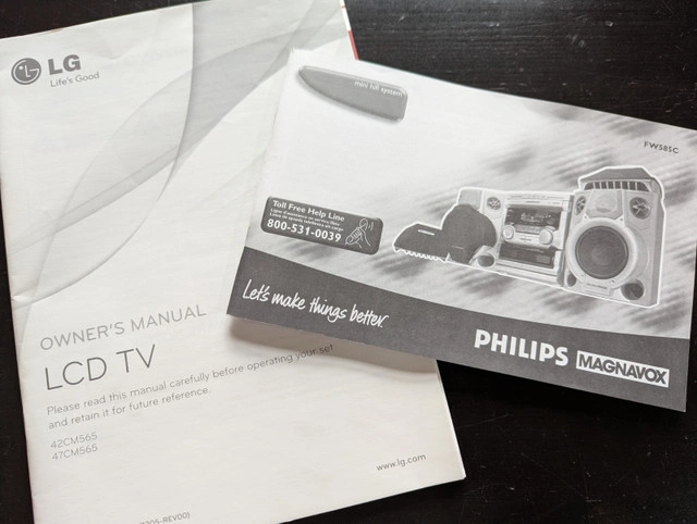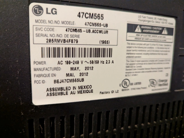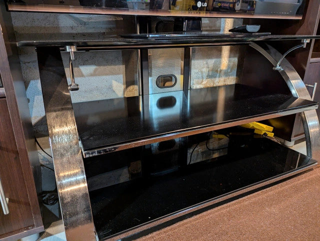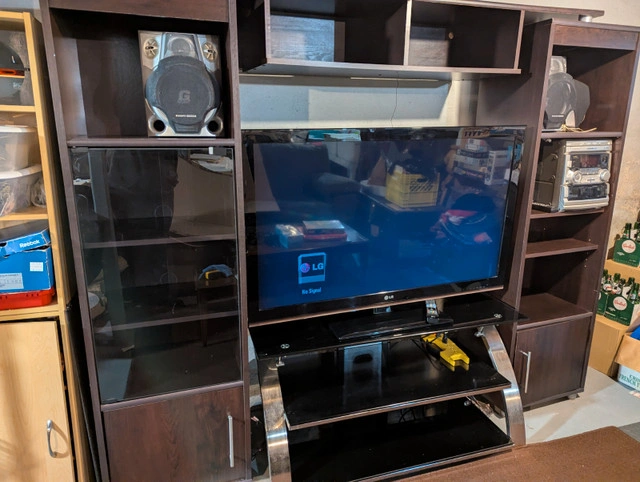 Perfect for setting up your basement entertainment area! I'm offering as a package for $100: 47" LCD television in like-new condition (LG 47CM565-UB), remote included. Great picture! Philips Magnavox 4-speaker surround stereo, remote included, with 3 disc changer and 2 cassette players. This stereo actually has surprisingly excellent sound, I'm leaving it plugged in so you can hear it when you come to pick it up. Wire it to the TV and immerse yourself in the surround sound! Known issue: Offspring's Smash is stuck in the disc changer and thus far I've been unable to remove it or get it to play a different disc, so you get the CD for free. Slick looking modern TV stand 44" x 20" x 23". Three shelves total including the top one that the TV can stand on, or mount the TV on the sturdy backplate up to 50" above the ground. Sorry, the wooden shelving glimpsed in the pictures is not included in the sale. Smoke free/ bug free home, available just about anytime for pickup in the St Boniface area of Winnipeg, if the ad is up it's still available. Asking $100 for this sweet entertainment package (cash or e-transfer only please).