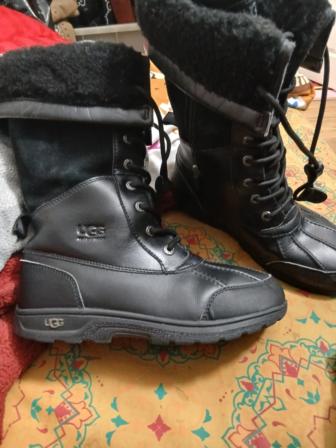 Selling a pair of UGG boots in black leather. They are in good condition and size 5. Perfect for the Canadian winter weather!