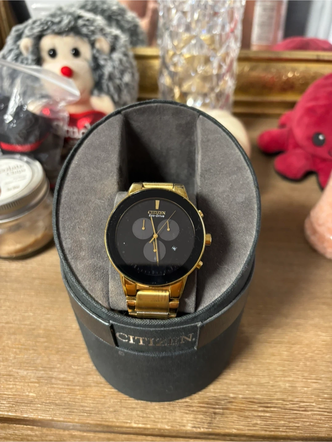 Selling a Citizen Eco-Drive watch in gold colour. It comes with its original box and extra links to adjust the size. It is in great condition!
