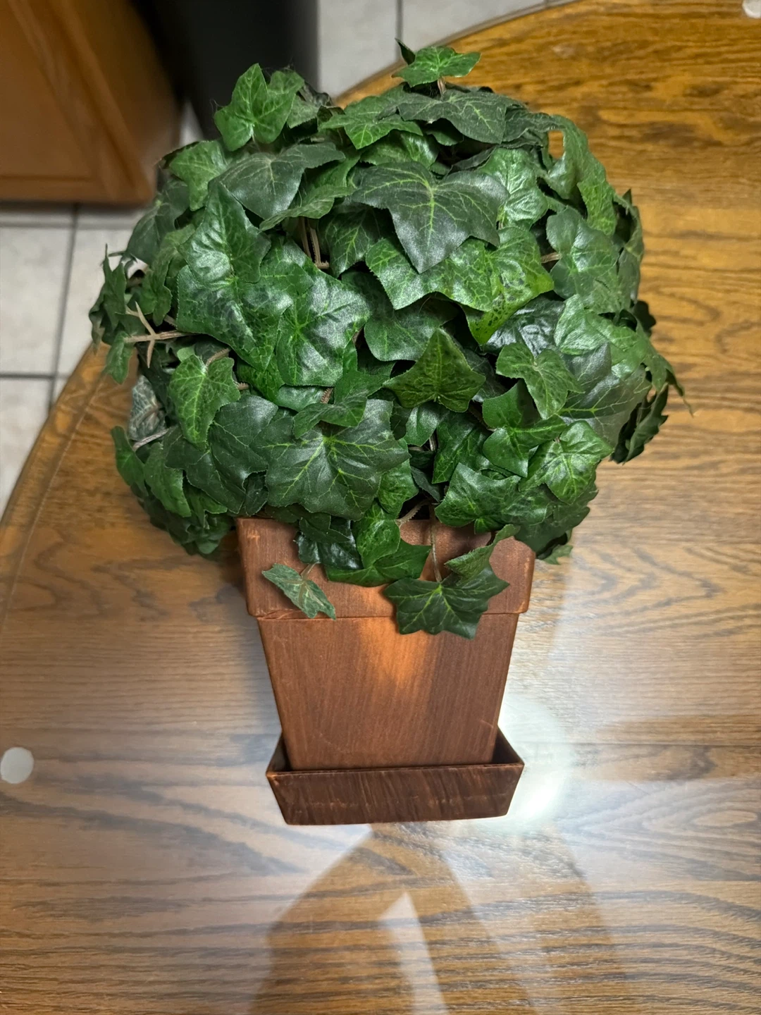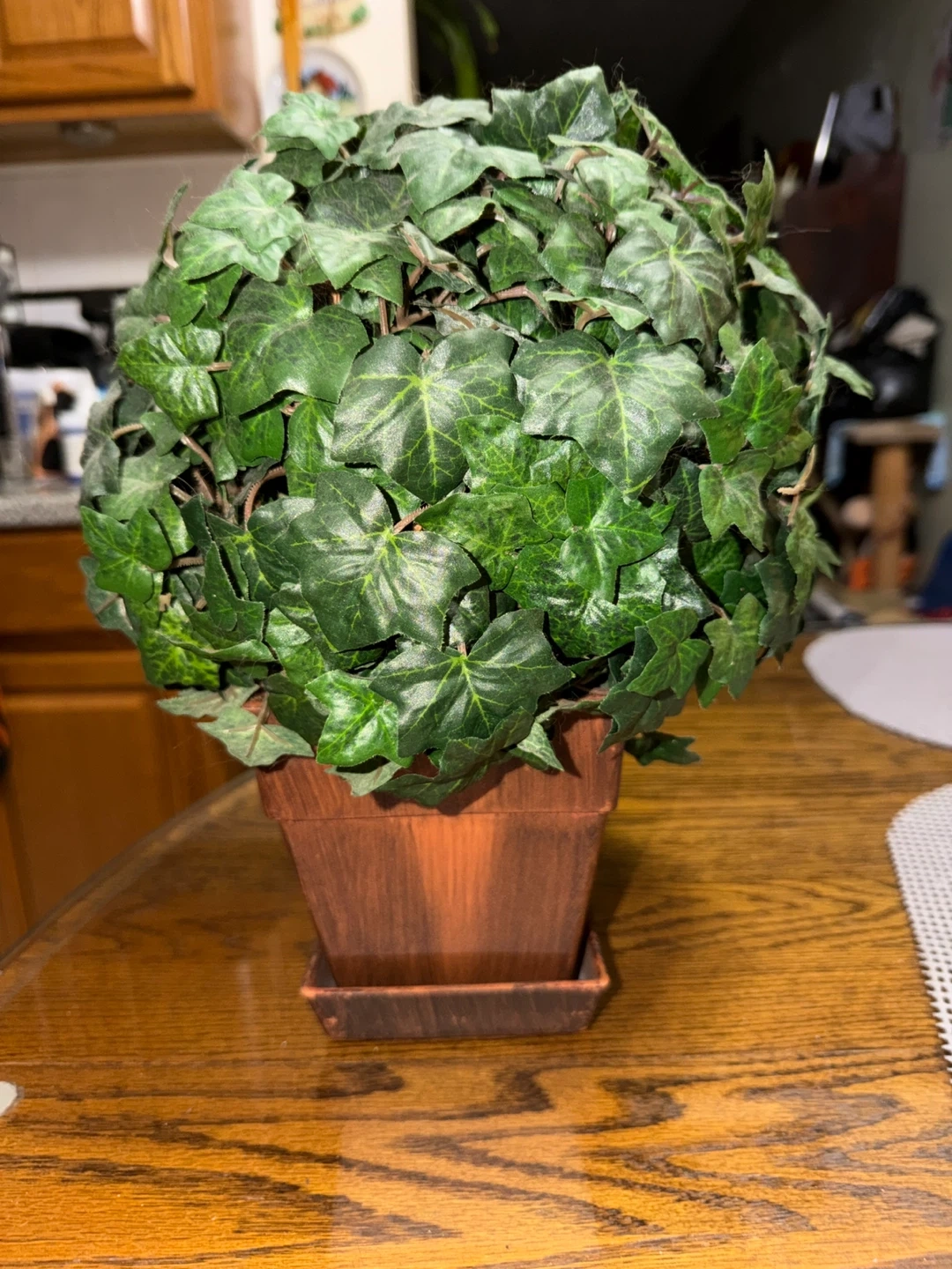 Add a touch of greenery to your space with this charming artificial ivy topiary! It comes in a cute pot and is perfect for adding a bit of nature to any room without the upkeep of a real plant. Has 2 lil slight cracks onto under the ivy