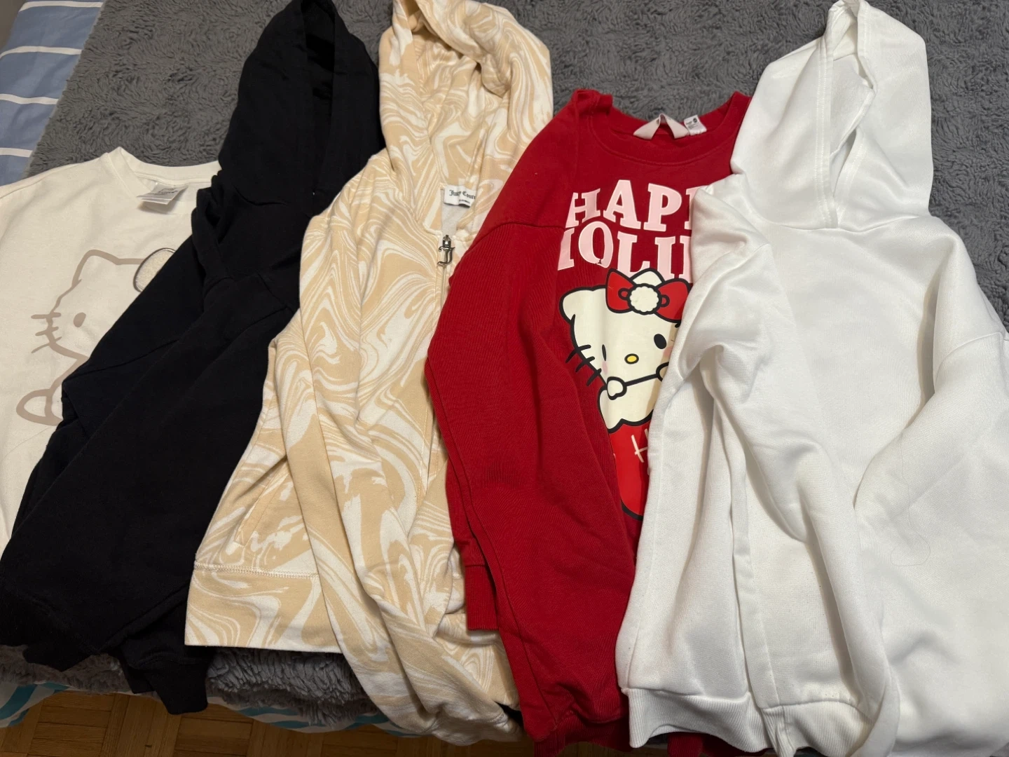 There's a Champion hoodie in black, and a Sanrio Hello Kitty sweater in white. Both are size M. 10-12 years old.They're in great condition and ready for a new home