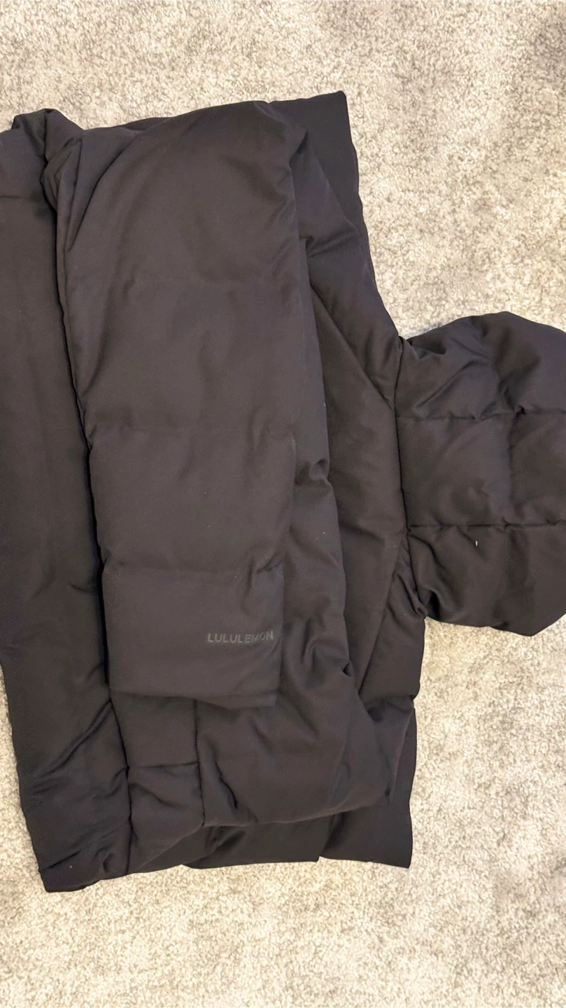 Selling a Lululemon down jacket in size XXL! It's made with 76% polyester and 24% elastomultiester for the body, and the lining is 100% recycled polyester. It also features 80% grey goose down and 20% grey goose feathers for the filling