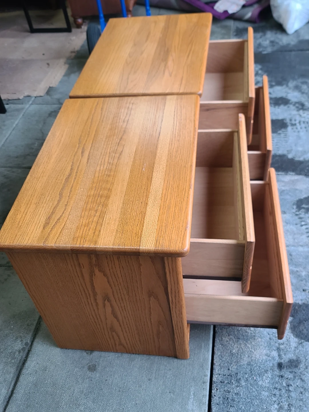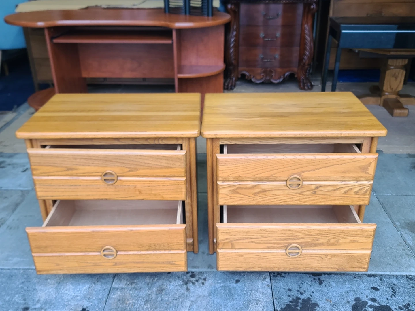 A set of two matching wooden nightstands. They feature two drawers each, perfect for bedside storage. They're in good condition and ready for a new home! Measurements: 26"×18"×23". Delivery can be arranged. Viewing and pickup by appointment.