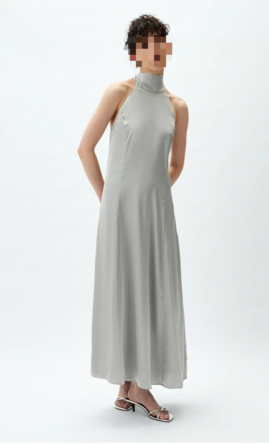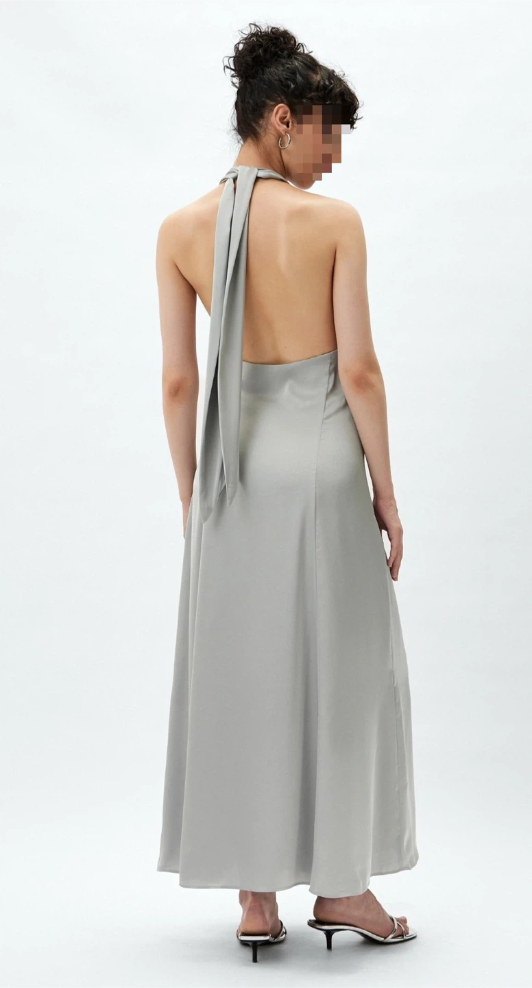 88H&M Satin Halter Neck Bridesmaid Maxi Dress. Ankle-length, halterneck dress in softly draping satin. Wide straps that tie at the back of the neck, a concealed zip in one side and an open back. Partly lined. Elegant and stylish. Perfect for a special occasion. Brand new with tags attached. Original bought price is $90 including taxes